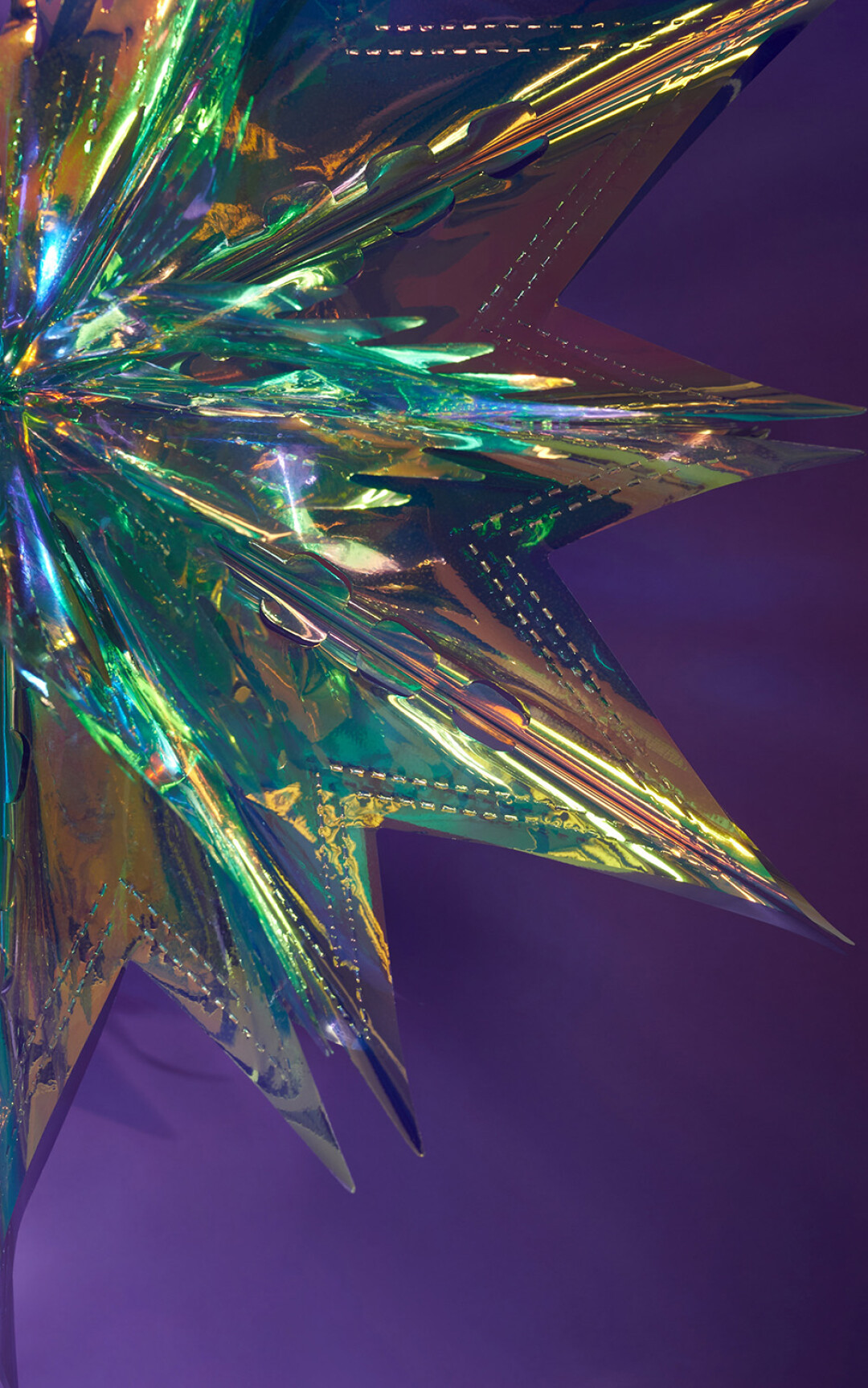 Если ночь будет в стиле диско, то подойдут радужные шары, снежинки с голографией и украшения из прозрачного рифленого стекла, которые будут переливаться в вечернем свете в стиле искрящихся восьмидесятых.