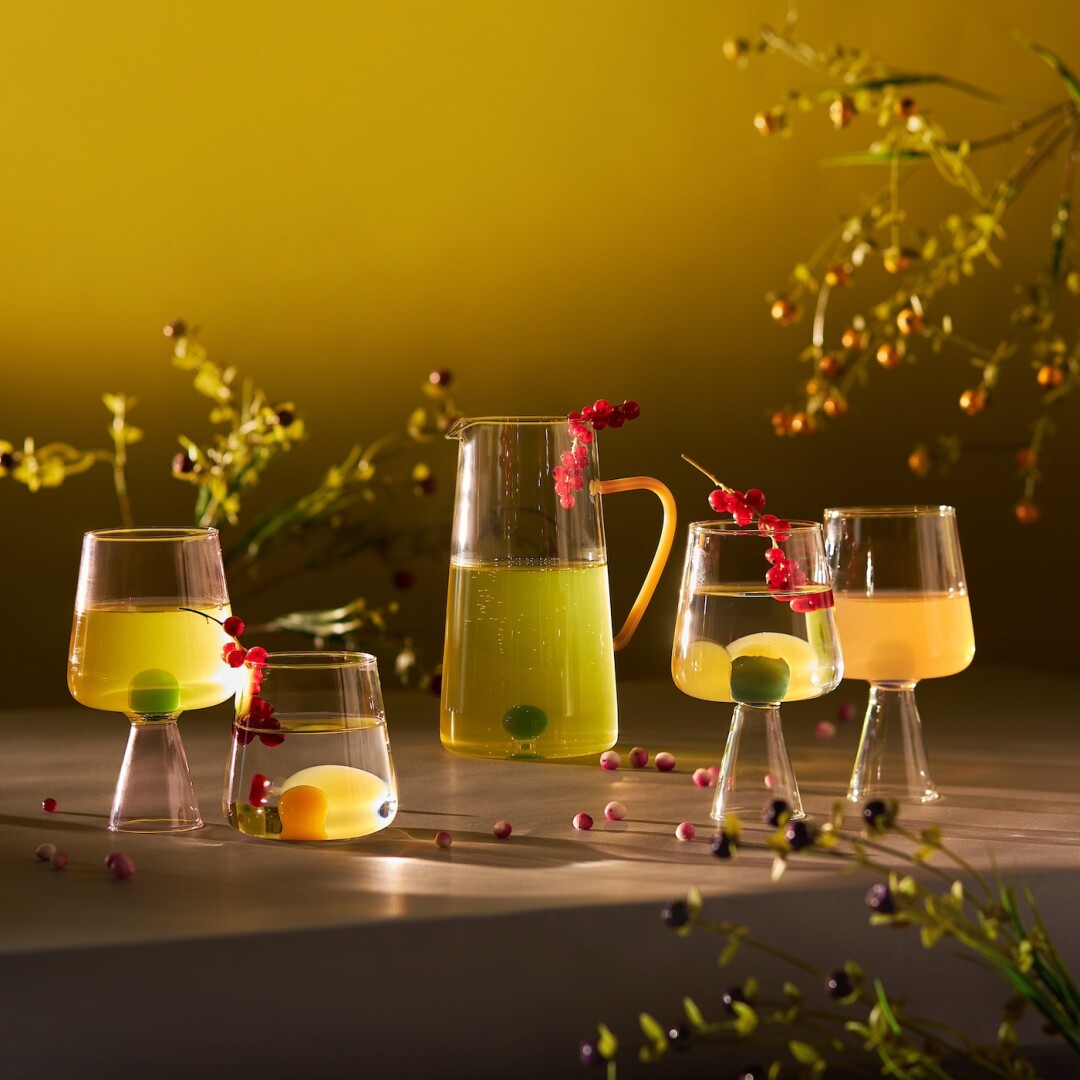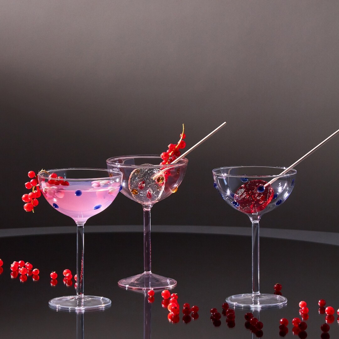 Pom-pon выглядит более традиционно, но благодаря крупным точкам из синего, зеленого, желтого и янтарного стекла, образующим тактильно приятный паттерн, посуда выглядит празднично и нарядно. В линейку вошли бокалы-креманки и стаканы для безалкогольных напитков.
