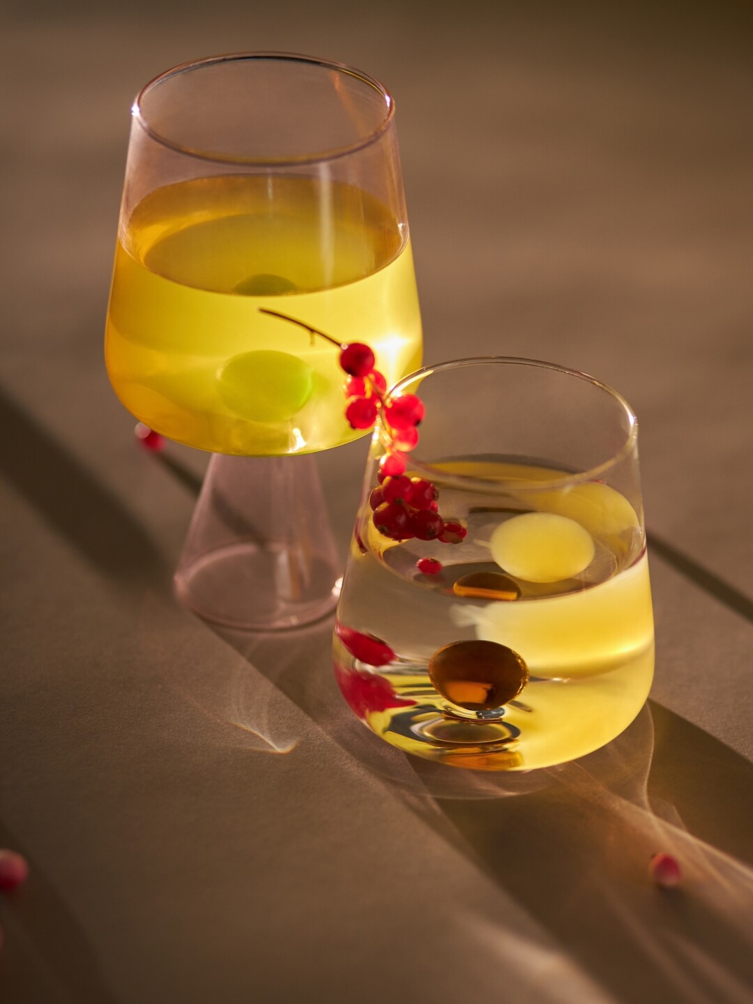 Российский бренд посуды Liberty Jones представил сразу две новых линейки — Orb и Pom-pon, в которые вошли бокалы, стаканы и другие предметы сервировки. Обе коллекции выглядят празднично благодаря декору из цветного стекла.