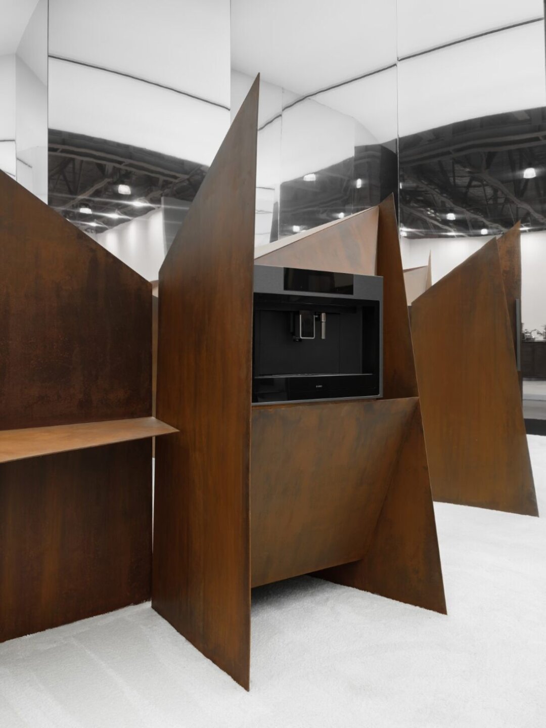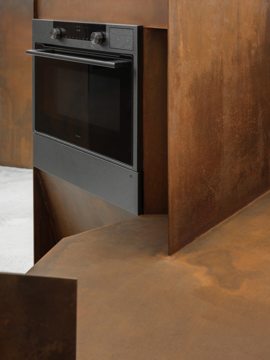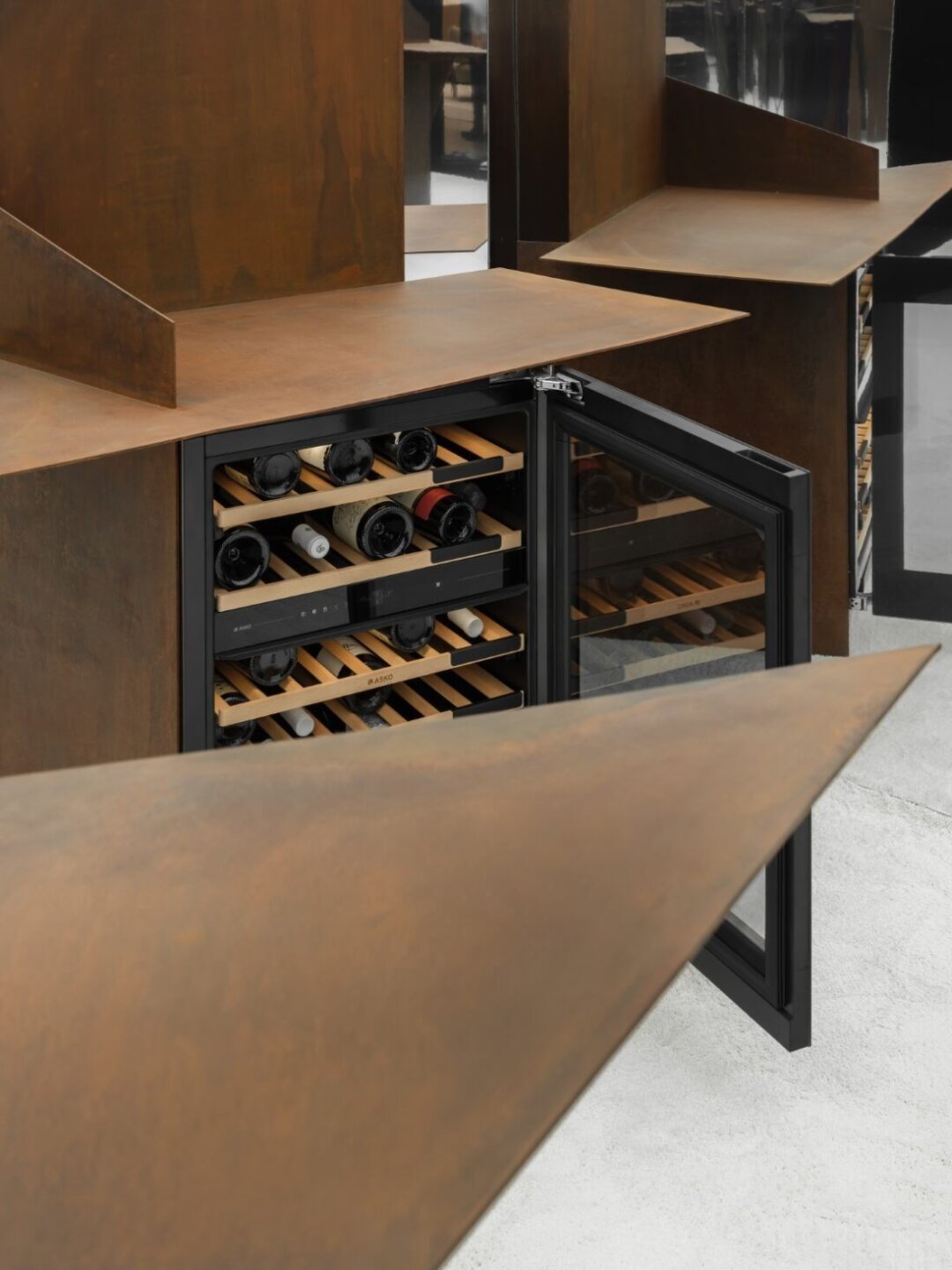 За строгими супрематическими объемами скрылась новая серия бытовой техники Asko: универсальный компактный духовой шкаф 5-в-1, вакууматор и кофемашина, а также варочная панель Elevate со встроенной вытяжкой и винный шкаф.