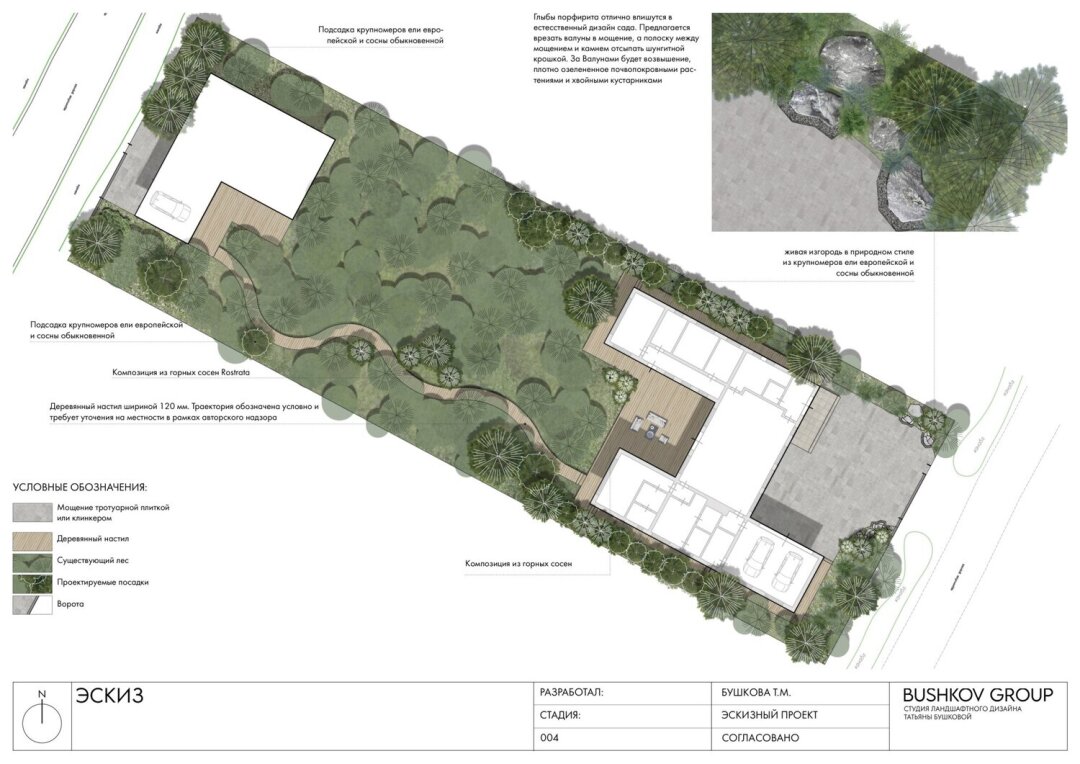 BUSHKOV GROUP — семейная компания: я отвечаю за концепцию, рабочую документацию и работу с растениями, мой брат Александр — за техническую реализацию и организацию всех работ. Мы работаем как слаженная команда: я проектирую, он воплощает. Когда проект готов, переходим к реализации — мы почти всегда выполняем ее самостоятельно, чтобы точно сохранить авторский замысел на всех этапах. Для меня важно не просто придумать сад — важно, чтобы он был реализован именно так, как задумывался.