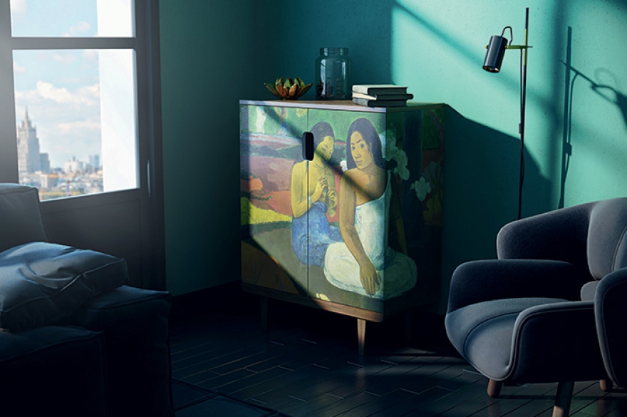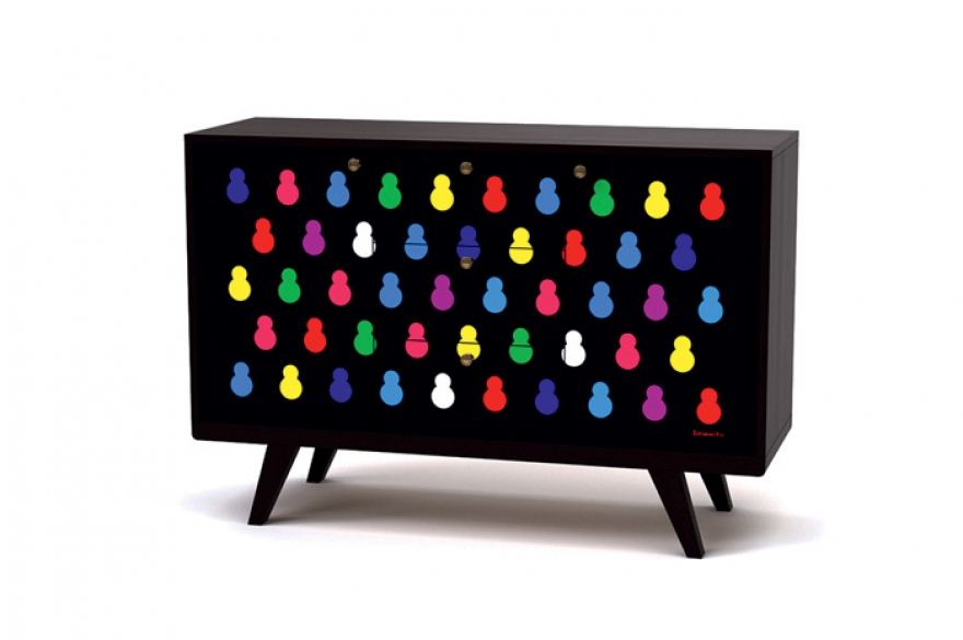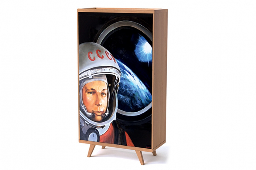 Стол Circle и комод Thimon стали дебютными изделиями для The Idea, стилистически они выдержаны в духе 1950-х годов. Кромка столешницы Circle окрашена яркой эмалью, которая не только скрывает торец МДФ, но и добавляет предмету необходимый цветовой акцент. На фасаде комода Thimon может быть напечатан один из пятидесяти принтов, имеющихся у The Idea, от репродукции «Большой волны в Канагаве» Хокусая и «Мира Таити» Гогена до орнаментальных отпечатков, а также любой предложенный клиентом. Так возникла коллаборация с петербургским художником Алексеем Сергиенко: на пятнадцати предметах воспроизвели картины из его серии работ «Родина», например — разноцветных матрешек или хрестоматийный портрет Юрия Гагарина в шлеме. Сегодня команда Гладарева работает над запуском производства модульного дивана и пары кресел, а также над линией корпусной мебели, где предусмотрены фасады с объемной фрезеровкой, цвет и дизайн которых заказчик может выбрать сам.