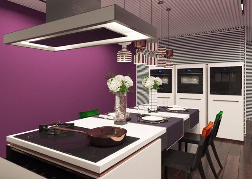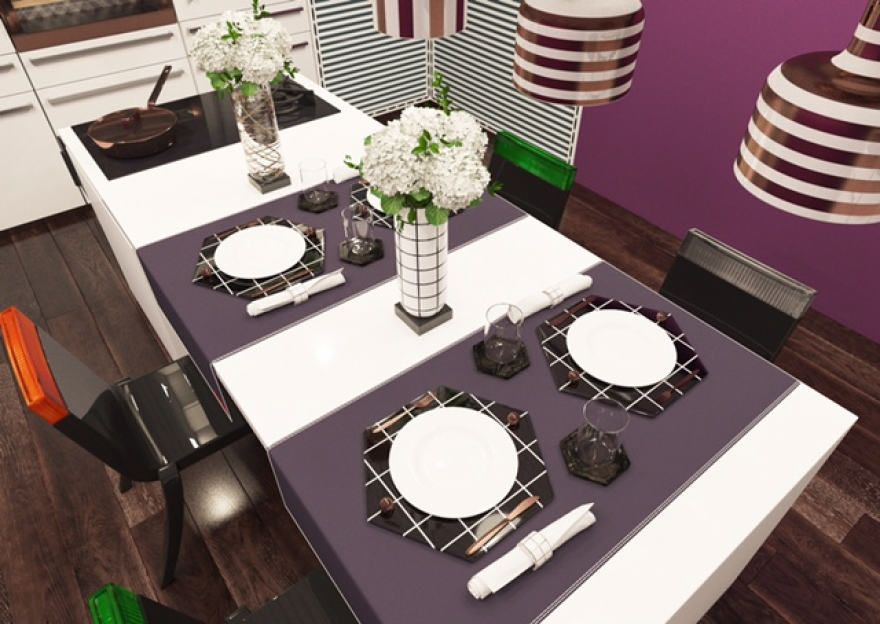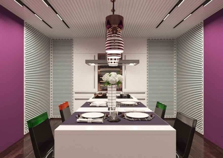 Фэшн-корни самого формата позволили дизайнеру смело экспериментировать с выбором цвета и отделок. Итак, контрастная черно-белая полоска, уже ставшая фирменной для авторских коллекций мебели Екатерины Елизаровой, стала смелым решением для отделки стен pop up store. Ее дополнили детали в виде стежков, выполненных вручную. А роскошный фиолетовый оттенок от Manders придал пространству благородный и одновременно ультрадизайнерский вид.