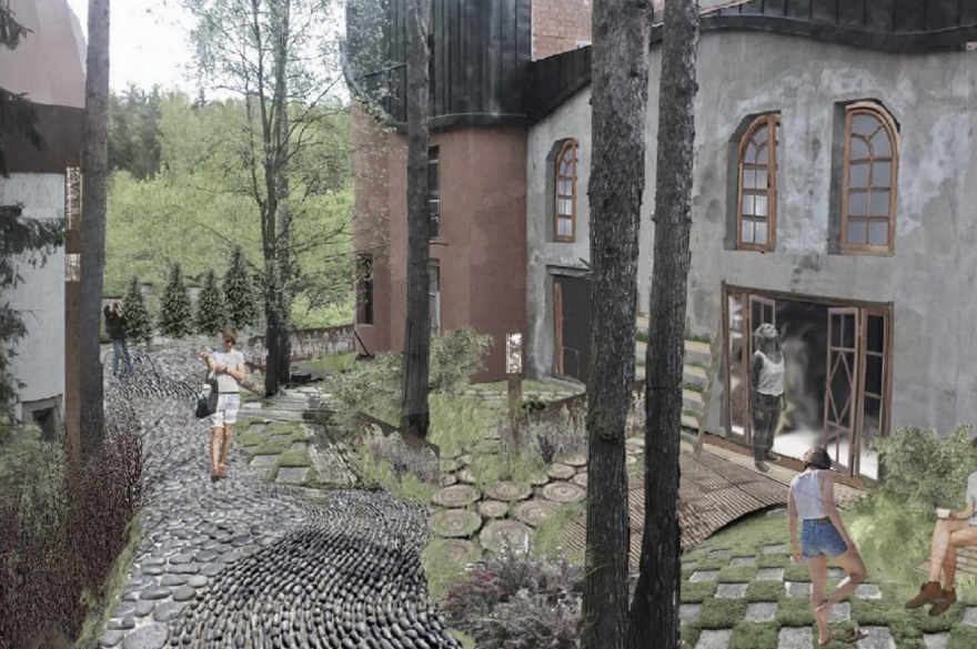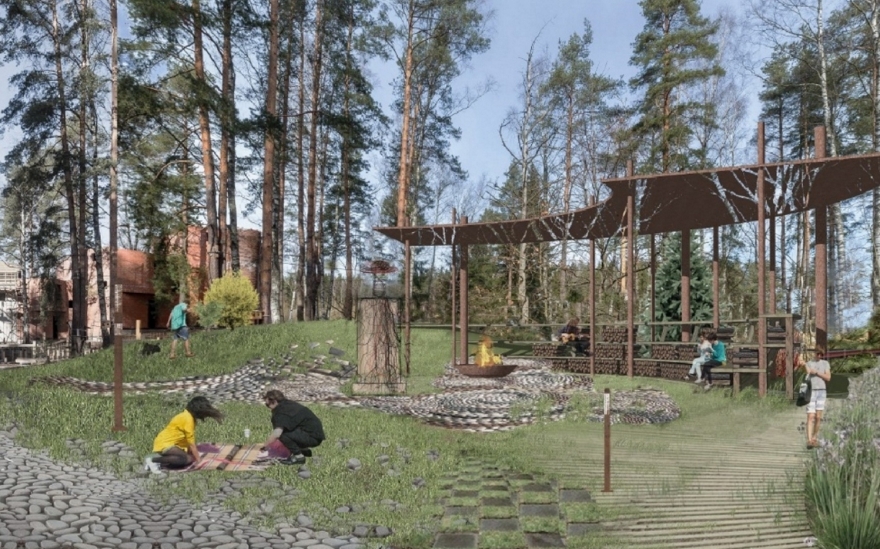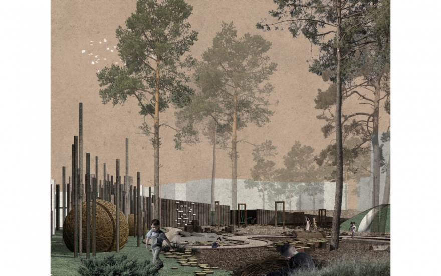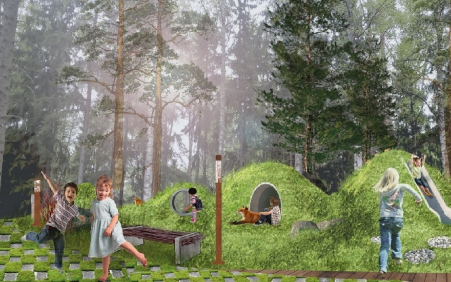 Основным мотивом этой работы стал особый «шифр» леса, а инструментом – его ярусность. Поскольку каждый лес обладает своим неповторимым силуэтом, здесь за основу взят абрис хвойного и смешанного лесов, произрастающих на территории нашей страны. Скамейки, ограды, навесы, фонари, пеньки, горки-норки, деревянные мостики – все идеально вписано в существующую экосистему леса, но при этому может использоваться человеком. В результате благоустройство не спорит с существующим ландшафтом и архитектурой. Колорит композиции придают выбранные для уличных покрытий ярусы мха, травы и дорожки булыжников, по которым приятно ходить босиком.