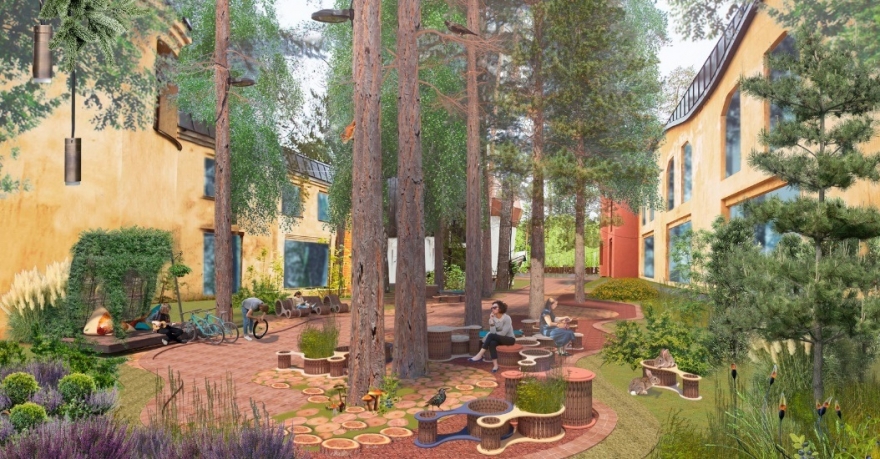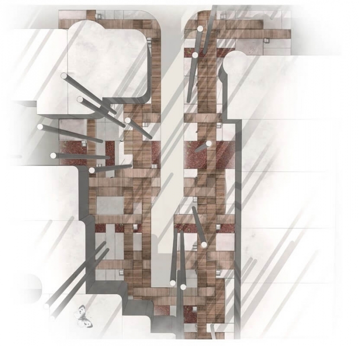 Здесь привычные атрибуты комфортной городской жизни – дороги, скамейки, фонари, урны – получают свободу и самостоятельность. Фонари ложатся на землю, хаотично группируются и иногда переворачиваются вниз «головой», а велопарковка превращается в просторный сад для отдыха велосипедов и их хозяев. Авторы вдохновлялись элементами, которые человек обычно использует в лесу, чтобы остановиться для отдыха: пни, камни, упавшие деревья.