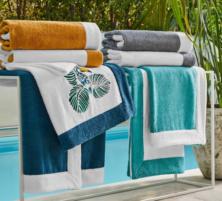 Льняное и хлопковое постельное белье из серии Tanger декорировано изогнутыми линиями и цветочным дамаском. Палитра представлена в зеленом, синем, бежевом, белом, мятном и бирюзовом цветах. Комплекты можно комбинировать с двухцветными полотенцами в морском стиле и пляжными полотенцами с вышивкой в виде маленьких попугаев.