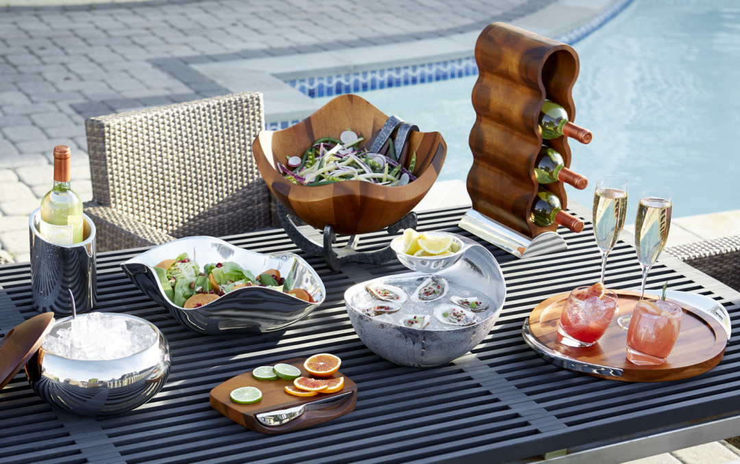 После сезонных обновлений в зале «Подарки и Декор» универмага «Московский» можно подобрать все необходимое для интерьера в стиле фьюжн. Например, для декорирования кухни стоит подумать о миксе изделий из разных материалов – дерева темных и светлых пород, стекла, фарфора, металла, пластика и текстиля. Для такого формата подойдет американский бренд Nambe, который сочетаает плавные и затейливые линии, сталь, а также дерево акации и канадского ясеня. Акцентом станет коллекция чайного или кофейного сервиза от португальцев Vista Alegre. Кроме того, дизайнеры фабрики предлагают подавать вино не в хрустальных, а в разноцветных стеклянных бокалах или керамических кружках.