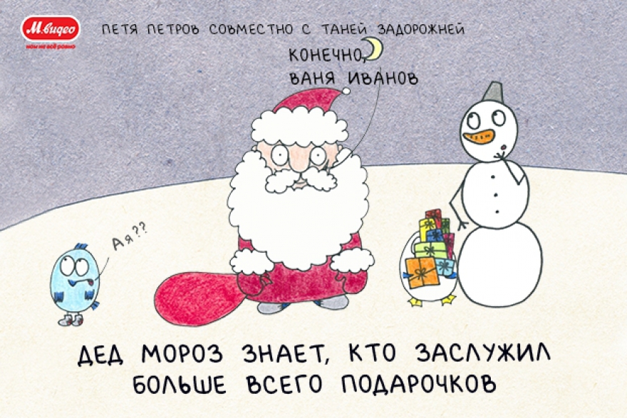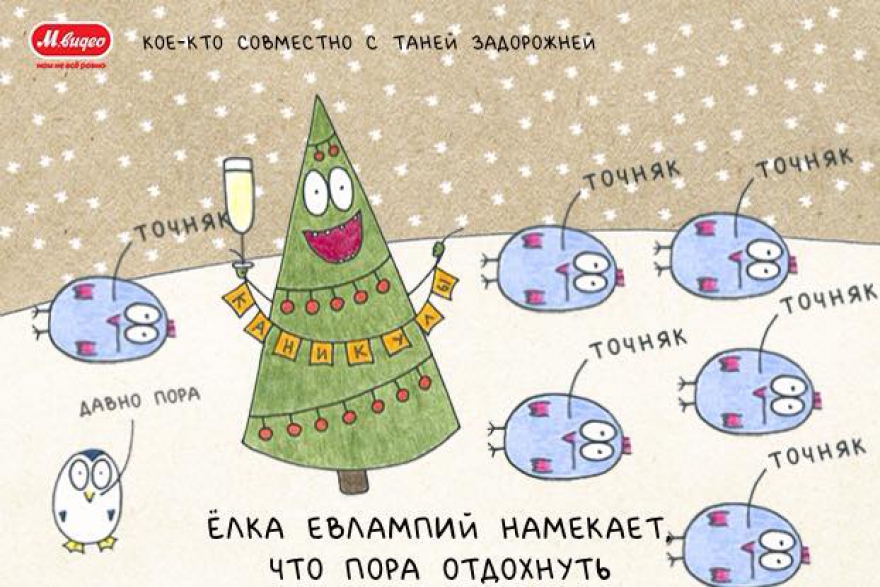 Картинки Татьяны минималистичны и многозначны, как иероглифы. А еще они умеют говорить. Собственно, в остроумных подписях, которыми сопровождается каждый рисунок, все и дело. Для сайта smile.mvideo.ru художница придумала целую порцию новых персонажей. Беззаботная елка, хозяйственный валенок, словоохотливая мандаринка… Просто выберите персонажа, который похож на вас или ваших друзей, украсьте рисунок оригинальными деталями на свой вкус — и небанальное поздравление добавится автоматически.