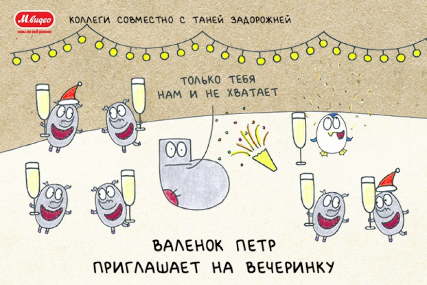 Хотите поздравить друзей небанально, но не можете придумать как? А вы попробуйте прикинуться валенком, организовать новогоднее обращение от лица мандаринки или написать к друзьям от имени носорога. Сделать это можно на сайте smile.mvideo.ru — проекте новогодних открыток от иллюстратора Татьяны Задорожней и «М.Видео». Впрочем, это гораздо больше, чем просто открытки.