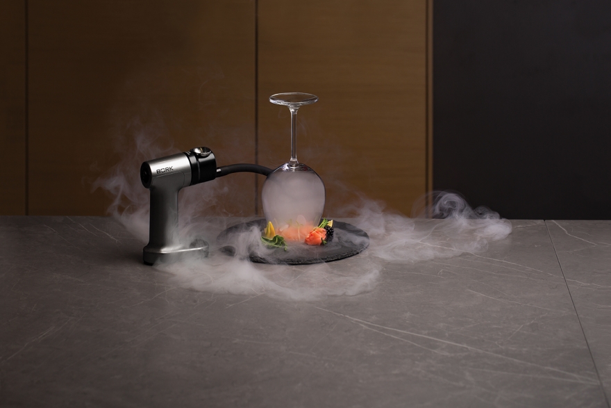 Новинка — модель Z610 Smoking Gun — от российской компании работает с помощью древесной щепы, которая загружается в камеру сгорания, и создает дым, подаваемый через силиконовый шланг, а степень копченого аромата и скорость приготовления блюд можно регулировать самостоятельно. Для мяса и овощей производители рекомендуют использовать щепу из бука – она придаст острый вкус. Древесина яблони подойдет для птицы, свинины и поможет создать сладкие коктейли. Среди авторских рецептов от Bork — копченое мороженое с вишней и бурбоном, коктейль «Кровавая Мери» с запахом дыма, сельдереем и копченым беконом, копченая грудка с соусом «Айоли» из перца халапеньо.