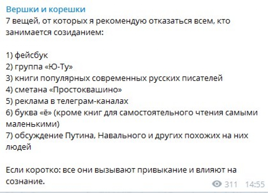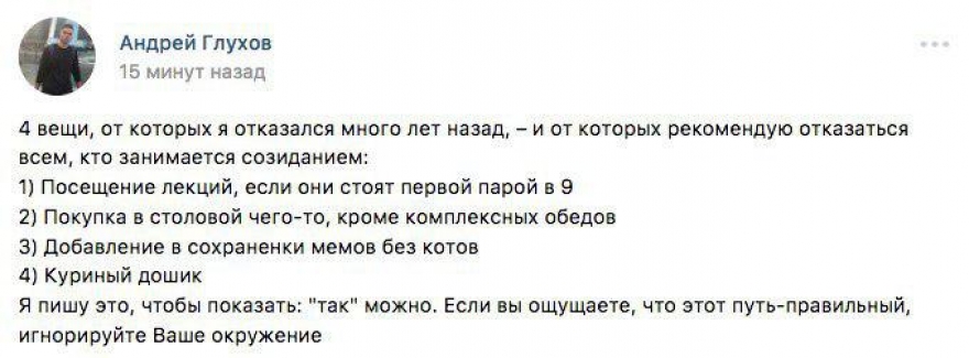 Основатель «ВКонтакте» Павел Дуров 10 октября отметил свое 33-летие и выложил на странице пост со списком из семи вещей, от которых он отказался много лет назад. Дуров советует всем, «кто занимается созиданием» сделать то же самое. Среди вещей, которых нет в его жизни — алкоголь, мясо животных, кофе и чай, фаст-фуд и газированные напитки, телевидение и таблетки. Его признание стало поводом для многочисленных шуток в соцсетях. Пользователи начали выкладывать собственные списки вещей, от которых отказались много лет назад а также сравнили список Дурова с новыми смертными грехами.