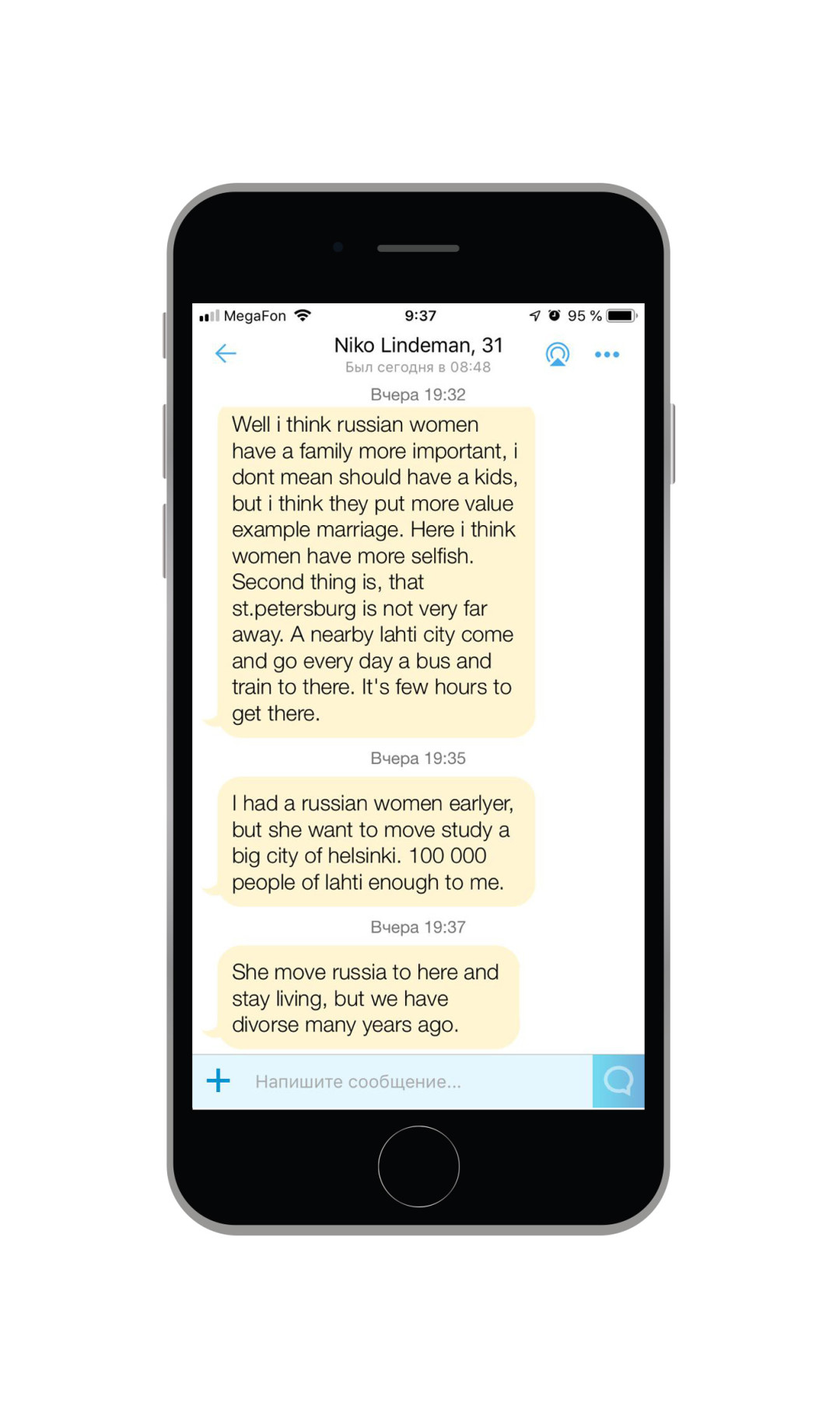 «Невеста из России» – бренд не хуже матрешек. В соседней стране он особенно востребован: из пяти с половиной миллионов жителей Финляндии двадцать тысяч – это русские жены! Русским и финнам легко заводить отношения – все же проще съездить на свидание в Хельсинки, чем в Сидней. Знакомиться с иностранцем на «Мамбе» тоже легко – сделав себе VIP-статус, указываешь в настройках конкретную страну – и вуаля, тебе пишут только из Финляндии.