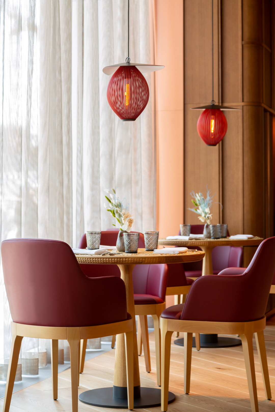 В основе дизайна интерьера, которым занималось бюро Archpoint — полотна известного авангардиста Марка Шагала и вечная тема любви. Главными цветами были выбраны ягодно-красный с винным оттенком как отсылка к флагу Швейцарии и изумрудно-зеленый, ассоциирующийся с русской малахитовой шкатулкой. Яркие оттенки играют на контрасте со спокойным светлым деревом. Природность интерьера подчеркивают экологичная мебель скандинавских брендов, рельефная стена с плетеным узором, напоминающим традиционную швейцарскую вышивку, столы со столешницами из камня «под малахит». На стене за декоративной сеткой легко разглядеть репродукцию одной из самых знаменитых картин Марка Шагала — «Над городом».