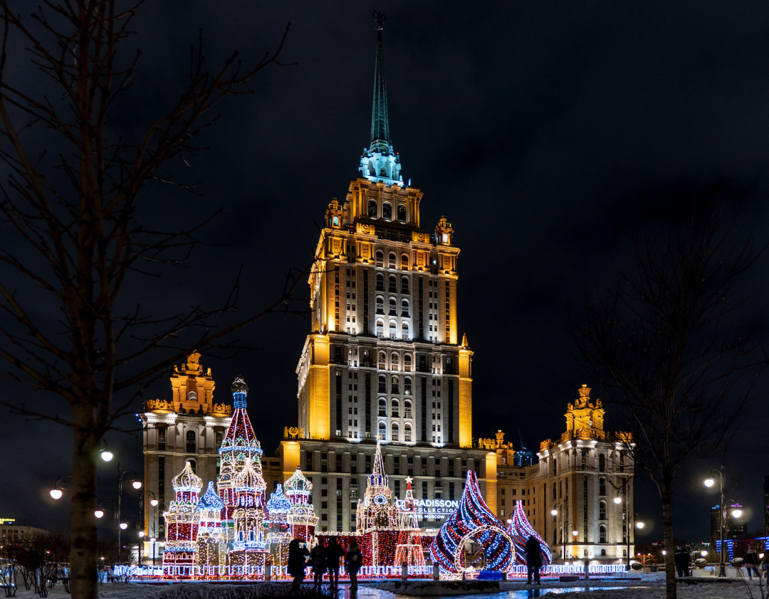 Radisson Collection Hotel, Moscow разместился во всеми известной гостинице «Украина». Это седьмая и последняя из построенных сталинских высоток, выполненная в стиле знаменитого сталинского ампира. Здесь по-прежнему хранится огромная коллекция культурно-исторических артефактов: скульптур, диорам Москвы и картин. Последних здесь 1256 штук! Это, возможно, крупнейшая частная коллекция советской живописи. Но это не все, что будет ждать внутри. Новогодняя сказка обеспечена: праздничный декор и сверкающие ёлки (55 штук!), имбирные домики и нарядные витрины, роскошные номера и внимательный персонал. А перед этим вас встретит подсвеченное 700 прожекторами здание, что подарит особое праздничное настроение.