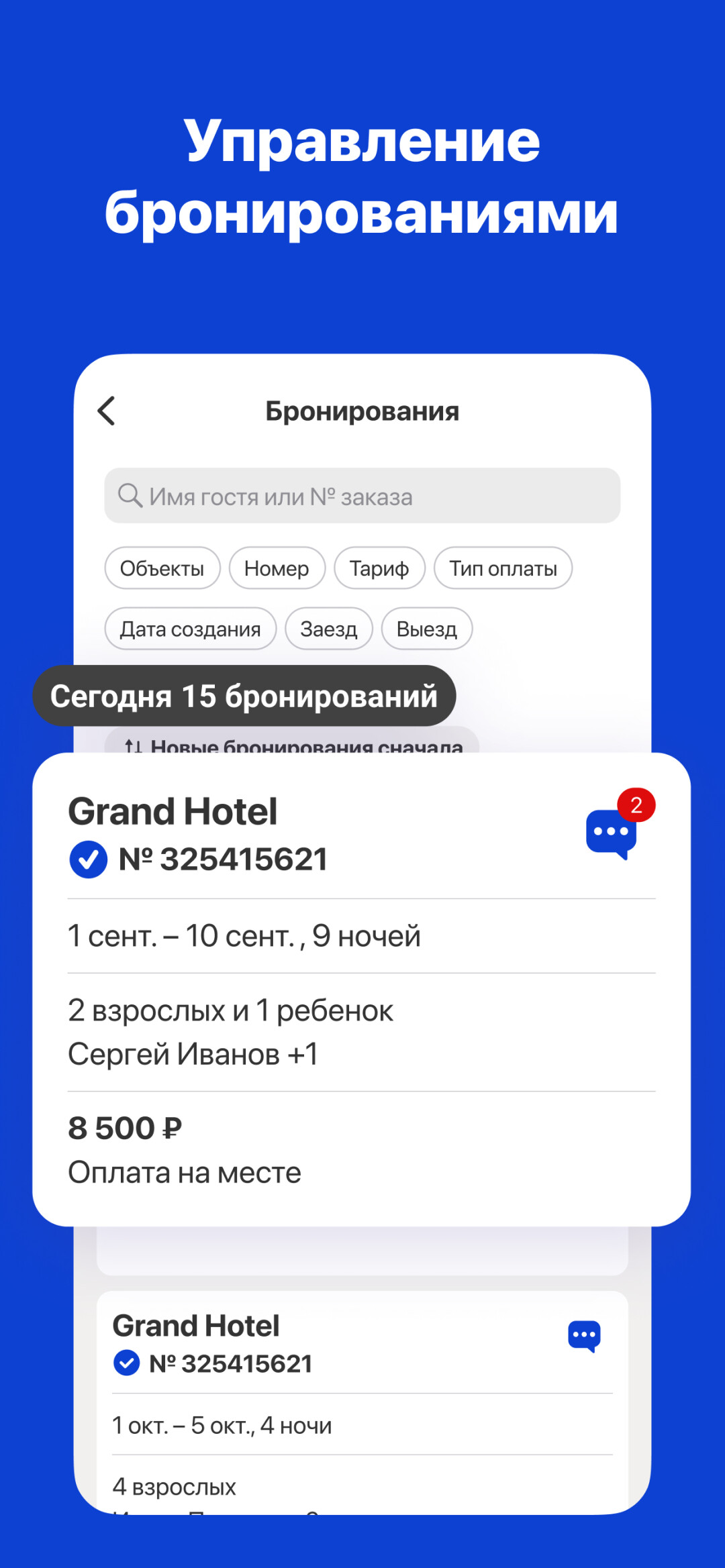 - «Бронирования» содержит всю информацию о заказах и удобные фильтры для поиска. Мгновенные push-уведомления оповещают отельера о новых бронированиях, изменениях или отменах заказов.