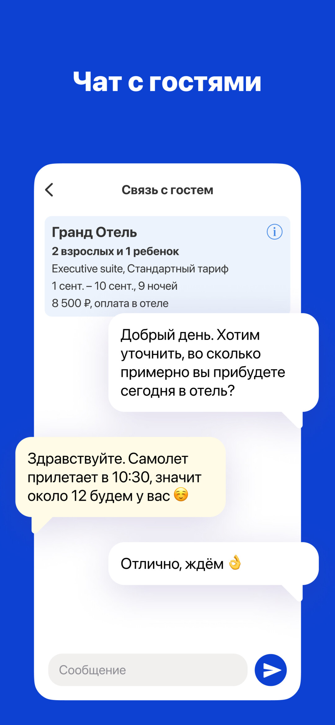 - «Сообщения» позволяет владельцам недвижимости связаться с гостями с помощью звонка или через чат и хранит историю переписки.