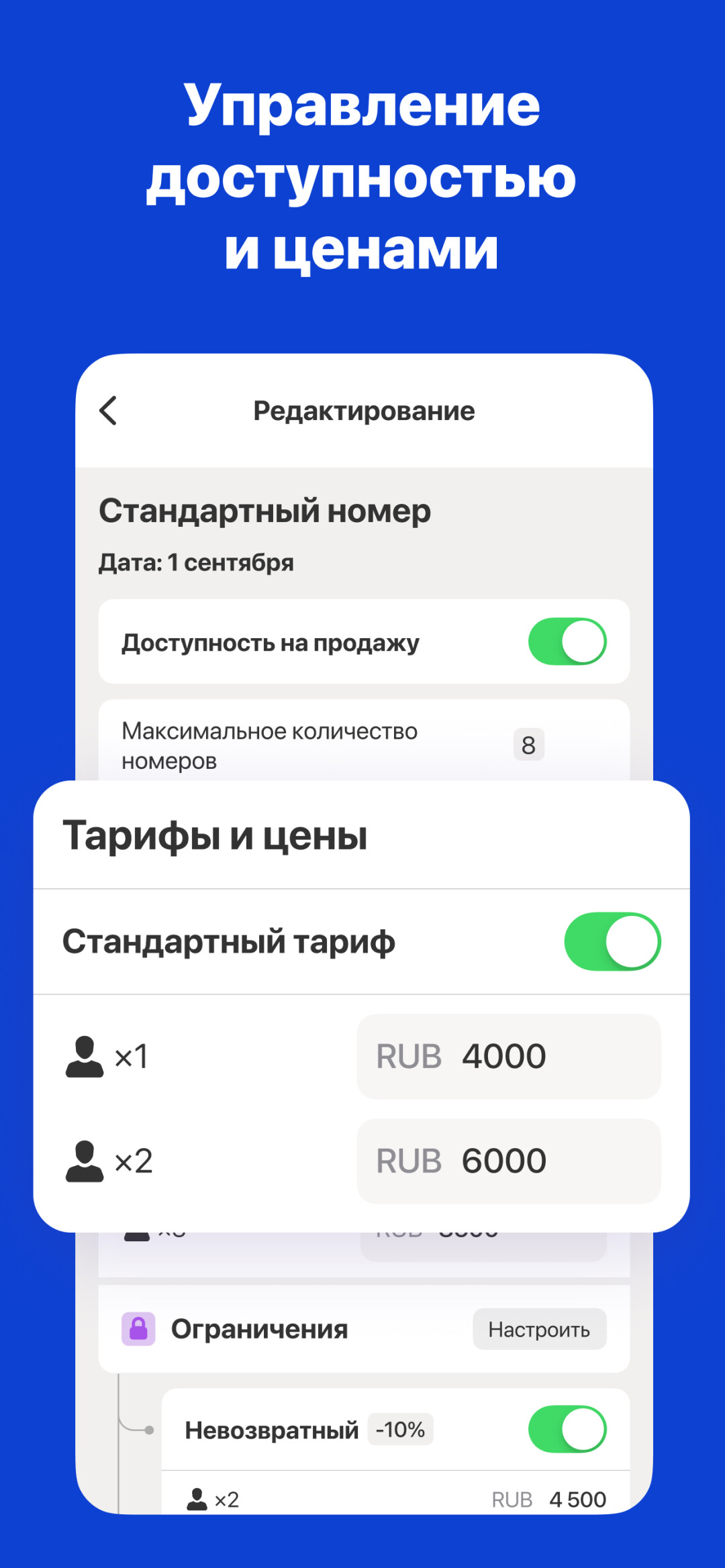 - «Доступность». Через него отельеры могут открывать или закрывать продажи на определенные даты, а также корректировать стоимость тарифов.
