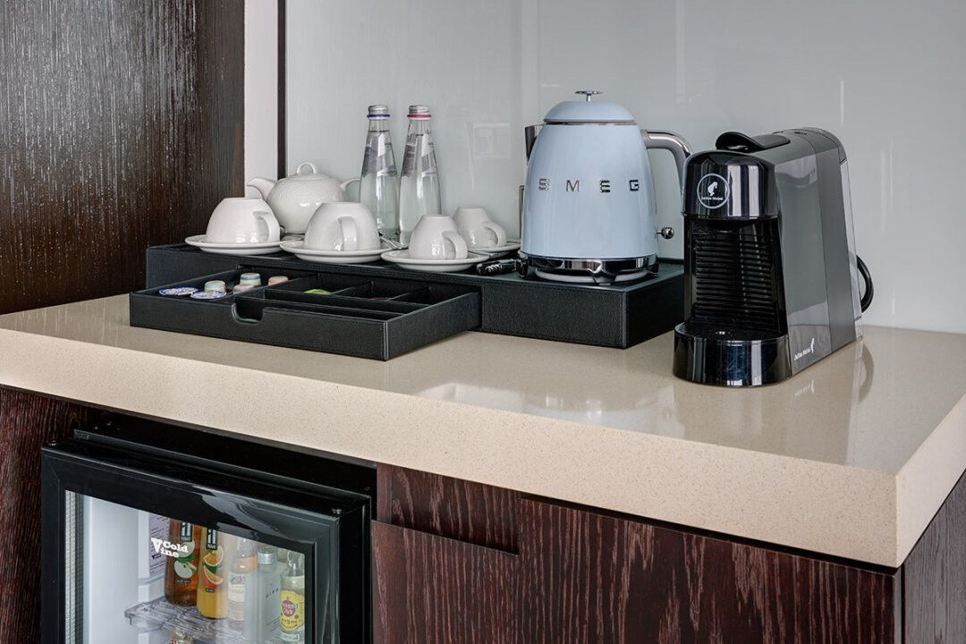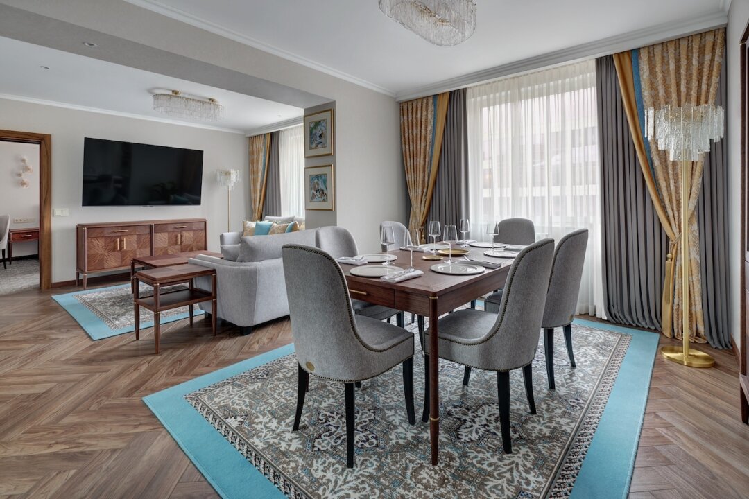 Общая площадь номера-трансформера — 125 кв. м (!). Здесь есть просторная гостиная с современной, отлично укомплектованной кухней, две комфортабельные спальни, уютный кабинет с рабочим местом в эркере, диваном и большой вертикальной откидной кроватью. Каждая секция имеет свой выход, холл с гардеробом, ванную. Если закрыть двери, то получится несколько отдельных номеров. Такой вариант идеален для большой семьи или дружной компании, когда важно сохранить приватность, но приятно провести время вместе.