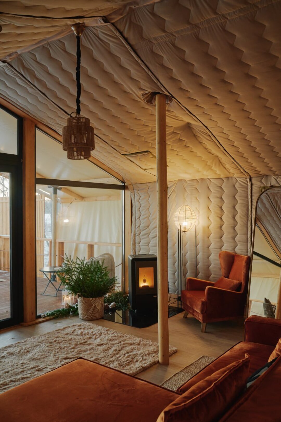 В загородном глэмпинге у Лемболовского озера есть 15 лоджей и одна вилла, в каждом — камин, просторная терраса, ванная комната, спальня и небольшая столовая зона. Лоджи на озере и кантри-дом дополнительно оборудованы фито-купелью. Возможно размещение с животными по согласованию с администратором.