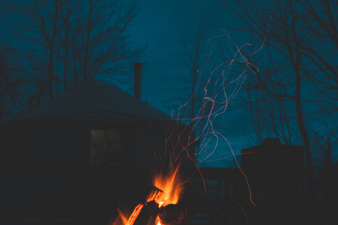 На первом этаже усадьбы работает ресторан: осенью и зимой организуют завтраки с 10 до 12, ужины с 18 до 20. На террасе каждого дома и шатра стоит индивидуальный гриль. Угли, розжиг и решетку можно приобрести на месте. Ближайший магазин — в 30 минутах езды от глэмпинга.