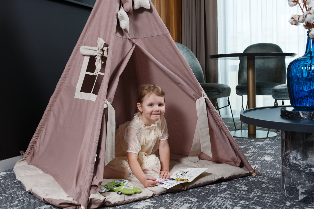 Под любые лайф-сценарии в отеле есть люксы и сьюты: для нежных свиданий, именинников или спа-девичника. В меню для молодоженов включен рейл для свадебных платьев, софиты для съемки, кресло для мейкапа и даже наволочки Mr & Mrs. C альфа-бэбис заезжаем в номера налегке — в их зубастом чемодане Sprayground только любимые плюшевые звери! Остальное уже приготовлено: от базовых халата, ванночки, горшка — до стильного вигвама для пряток и экологичных игрушек.