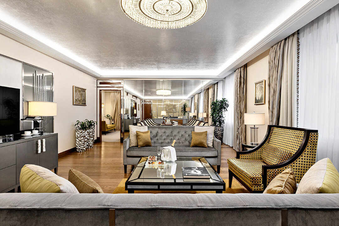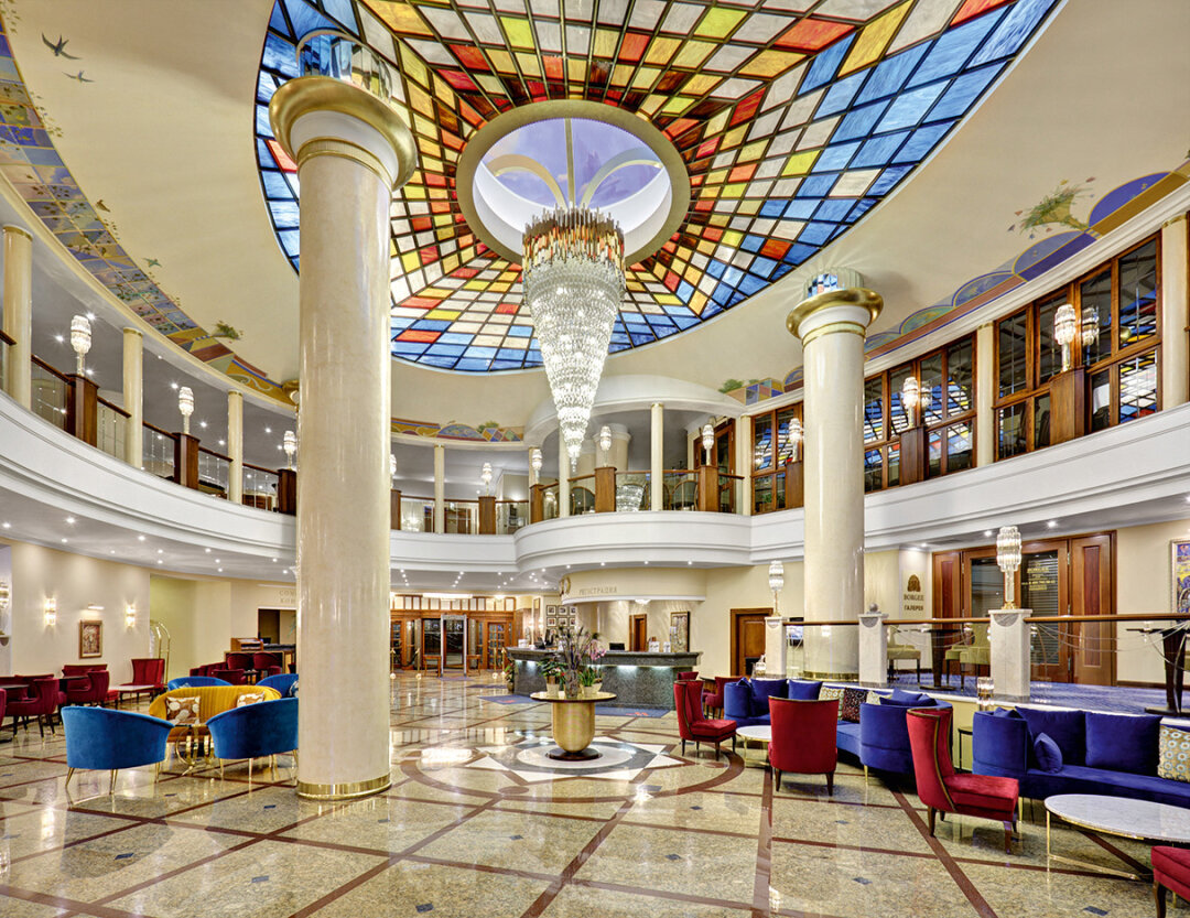 В композиторских люксах «Чайковский», «Бородин» и «Глинка» «под ключ» сработала австрийская компания Robert Wolte & Partner (специализируется на оснащении и реновации отелей!), под чутким руководством владельца Роберта Вольта, ценителя русской классики. Добротная австрийская мебель из бука с ручками из филиппинского перламутра, дубовый паркет и бельгийские ковры, сотканные по авторским принтам. Под стать репертуару — парадные интерьеры и картины из цветного стекла по сюжетам «Лебединого озера», «Пиковой дамы», «Князя Игоря» — в старинной витражной технике художника и ювелира Луиса Комфорта Тиффани (сын того самого Чарльза Тиффани, которого знает каждая невеста). По-филармонически ярко горят люстры и лампы из венецианского стекла. В ванных комнатах «звучит» итальянский мрамор «Бьянко Каррара» и бразильский гранит «Азул Макаубас».