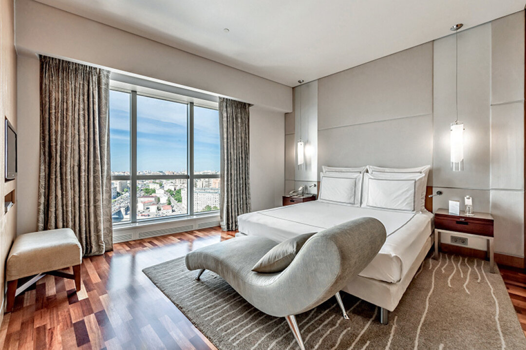 Ни на шаг не отклоняясь от курса, заданного швейцарским брендом, 20 лет «Swissôtel Красные Холмы» парит в небе над Павелецкой площадью. Команда Юрия Гнедовского из «Товарищества театральных архитекторов» проектировала отель как доминанту делового комплекса «Риверсайд», куда входят и бизнес-центры, и Дом музыки (типичный пример московской застройки 2000-х). Финальное слово за локацией — стрелка Кремлевского острова, где встречаются Москва-река и Водоотводный канал. С высоты 140 метров и панорамы в 360 градусов видно все! И Кремль, и храм Василия Блаженного, и все семь высоток, «Москву-Сити» и Останкинскую телебашню.