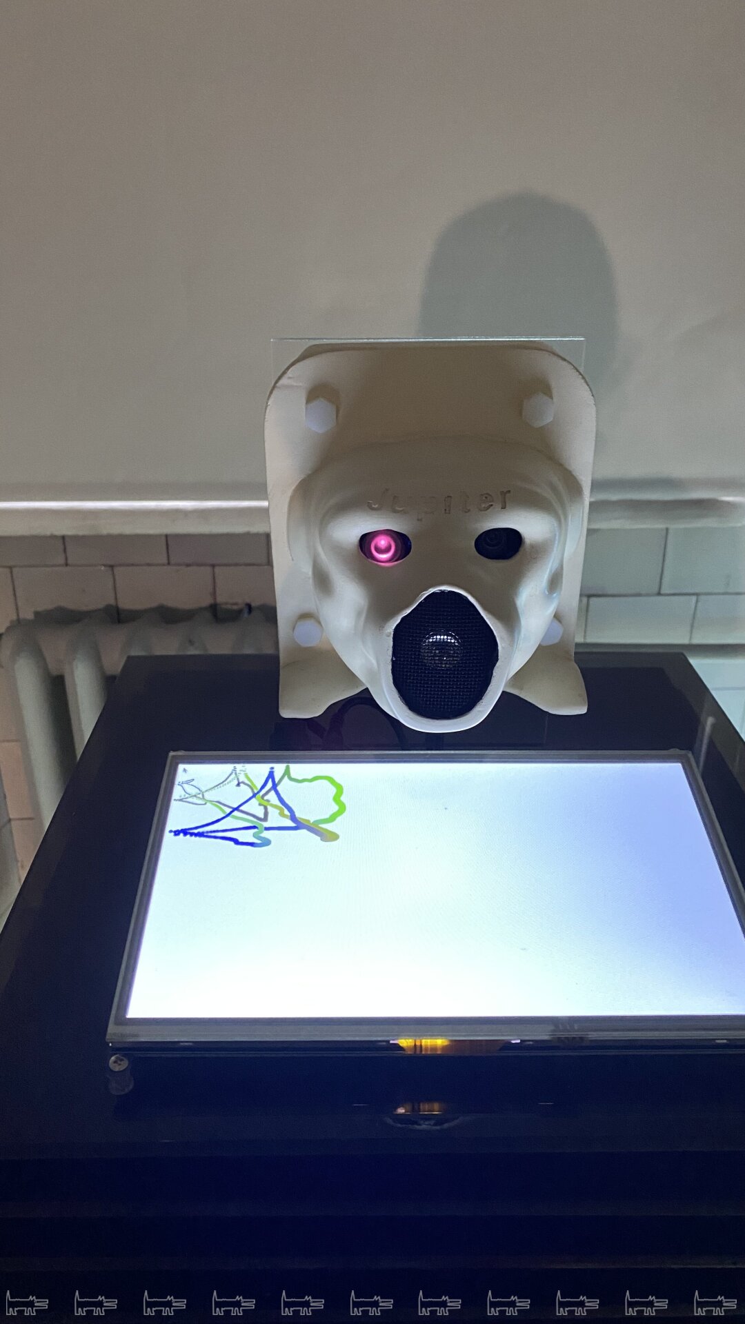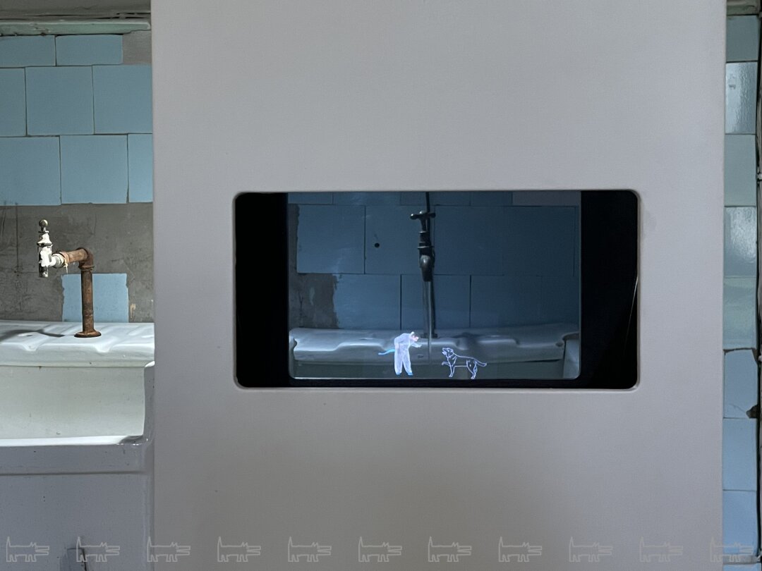 В бывшей операционной, как только заходим в нее, компьютер начинает сравнивать наш геном с геномом дрозофилы (самое распространенное насекомое в лабораториях генетиков во всем мире), а затем визуализирует разницу наших геномов на цифровом рисунке (переплетения кодов ДНК похожи на шерстяной шарф, который ИИ тут же принимается вязать, управляя настоящей вязальной машиной). В другом кабинете живет двойник обезьяны Юпитера, работающей с учеными, — ее живые данные, загруженные в нейросеть, запускают программы реакции на посетителей, и нейрокопия Юпитера рисует наши эмоциональные портреты на планшете. Пройдя далее по коридору, слышим брачную песнь насекомых, страдающих Альцгеймером, и пытаемся понять, как самки «отбраковывают» негодных самцов по пению. А в следующей «процедурной» сравниваем свою реакцию на определенные запахи с реакцией пчел.