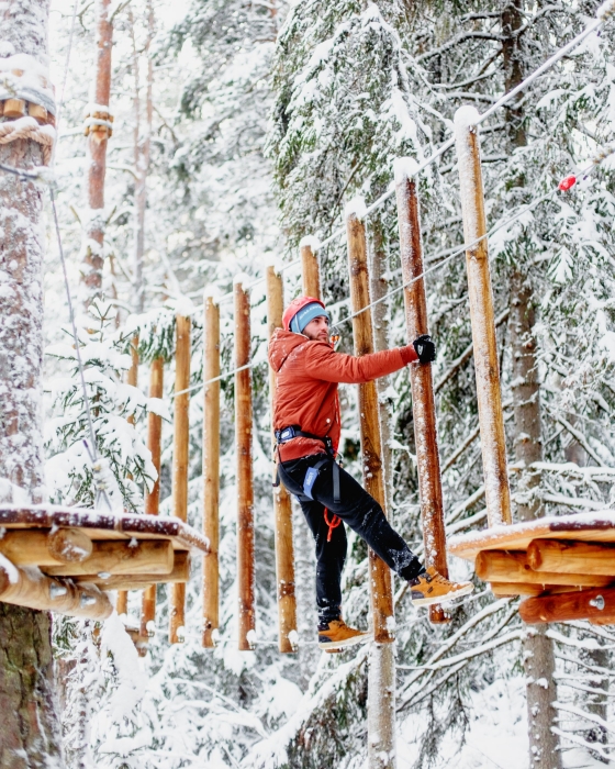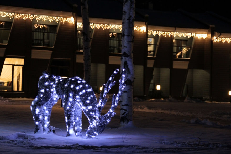 При одном виде завораживающих величественных пейзажей организм сам собой блокирует режимы «аврал», «стресс», «бессонница», «усталость». Городскую суету сменяет непривычное спокойствие, когда хочется не мчаться сломя голову, а неспешно созерцать. Впрочем, это совсем не значит, что здесь невозможен активный отдых. Промчаться на снегоходе по замерзшей глади Ладожского озера — пожалуйста! (Имеется даже детский снегоходный маршрут.) Есть тут и природный каток. Охота покататься на квадроцикле по сказочному зимнему лесу — не вопрос. Можно пройтись между верхушками вековых сосен по веревочному парку-променаду на высоте 16 метров — три захватывающих, но совершенно безопасных маршрута открыты круглый год. Отправляясь на прогулку по территории, захватите пару яблок, чтобы угостить местную достопримечательность — северную олениху Дашу. А тех, кто 31 декабря и в другие дни ходит с друзьями в баню, ждет русская парная на плоту. Словом, гостям гарантировано полное слияние с природой и незабываемый отдых. И потом еще «долго будет Карелия сниться».