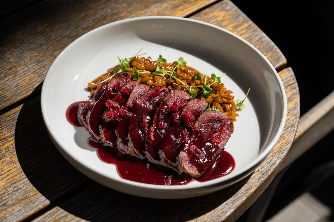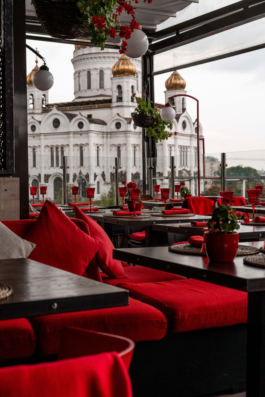 Гордость террасы — открыточный вид на храм Христа Спасителя. С 2019 года кухней ресторана заведует Сергей Волконенков. В его ведении едва ли не самый широкий на сегодняшний день выбор мясных деликатесов. В меню около 20 видов стейков, несколько вариантов ребрышек, оленина и многое другое. Стоит попробовать мраморные подушечки с говядиной Dry Age, классический тартар из говядины и один из стейков, например, титульный «Воронеж Прайм» — тонкий край на кости с выраженным мясным вкусом.
