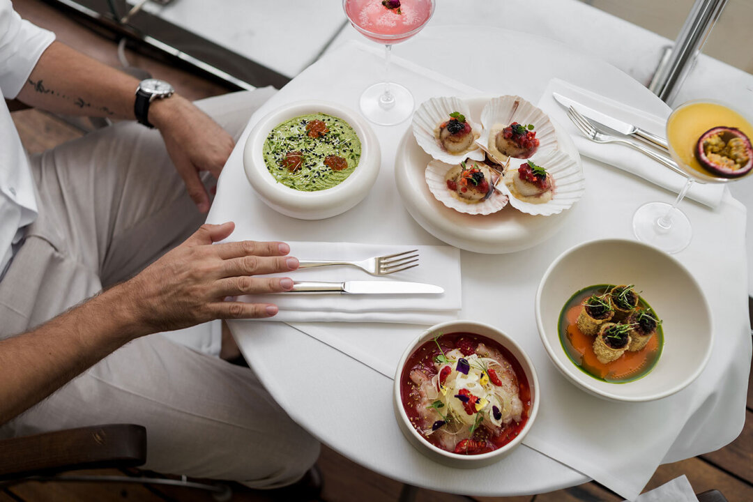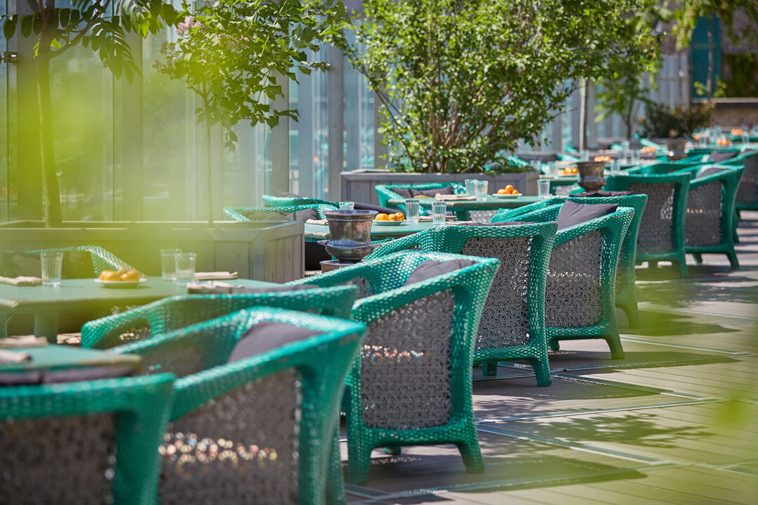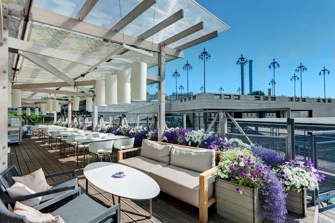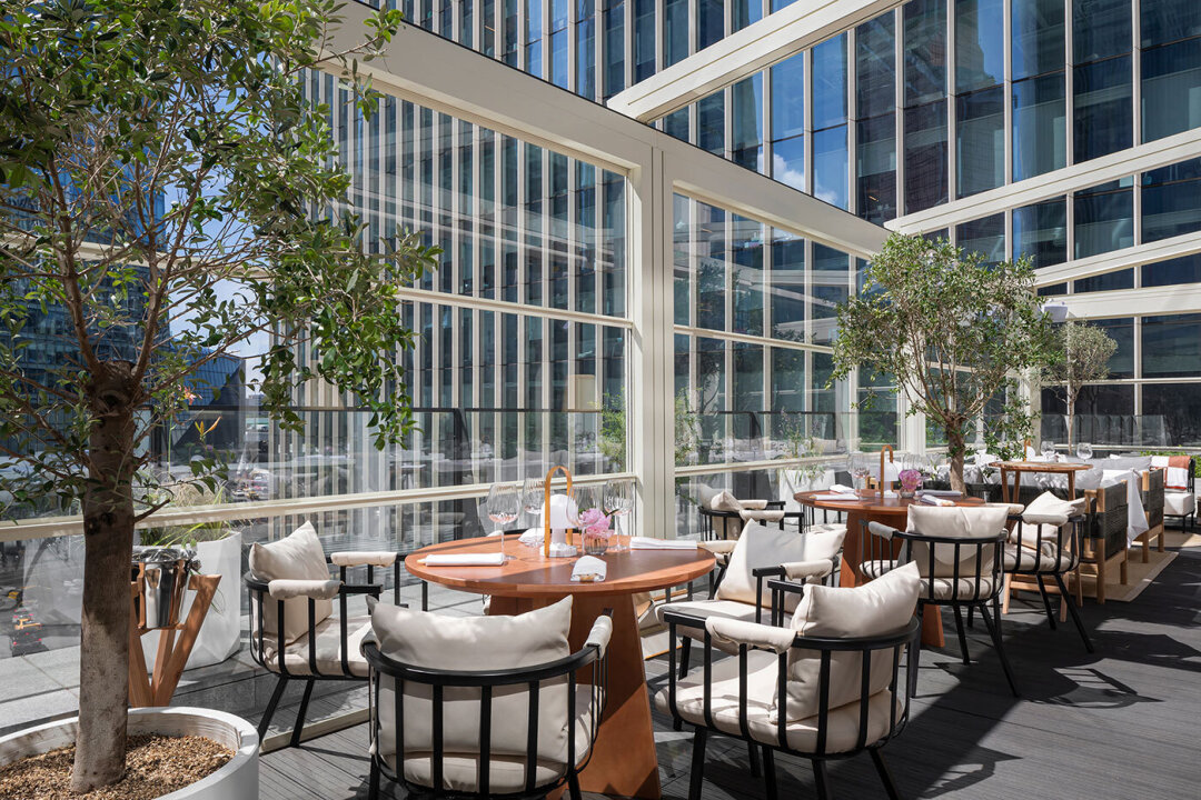 Впечатляющий вид на сверкающие небоскребы Сити, белые скатерти, элегантная плетеная мебель и оливковые деревья, прозрачные экраны, стирающие границы между террасой и мегаполисом, и крыша-маркиза, которая укроет от любых капризов погоды, — на этой веранде запросто можно поймать себя на ощущении, что ты движешься между небом и землей на бесшумной океанской яхте. Для самых ярких впечатлений берите суп марсельских рыбаков на компанию, для себя — дорадо с горошком и зеленым карри и коктейльный мастер-класс.