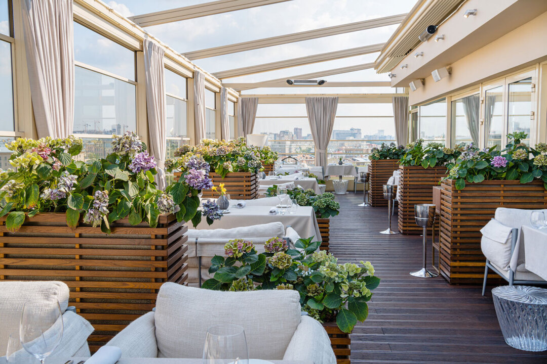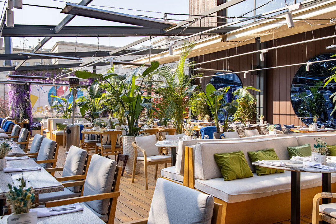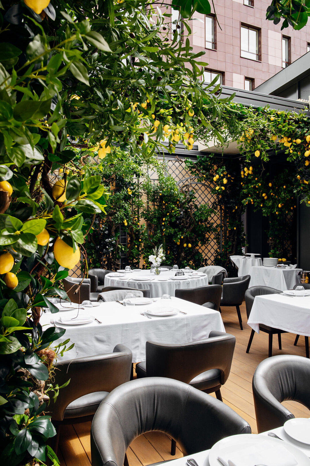 Самая «сицилийская» терраса города украшена зеленой изгородью с большим количеством ярко-желтых лимонов. За декором скрыта высокотехнологичная конструкция: раздвижная крыша, позволяющая обеспечить естественный свет или укрыть от непогоды, и автоматические жалюзи в стиле римских штор, обеспечивающие приватность обстановки. За бокалом «Беллини», который здесь готовят с пюре из белых персиков, будет время выбрать свой ужин — тирадито по-сицилийски, букатини аматричана, телячьи почки и пицца «Феррари» в придачу.