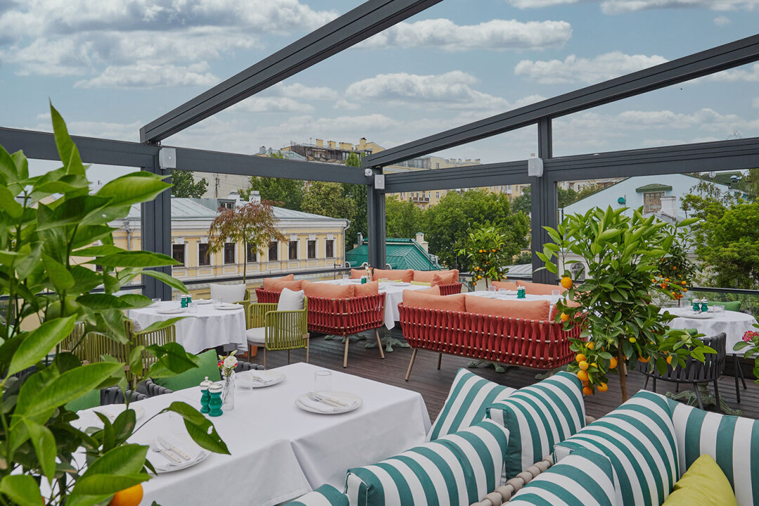 Вид сквозь деревянные шпалеры, увитые плющом, мандариновые деревья и пышные шапки гортензий на особняк эпохи модерна, сталинскую высотку и небоскребы Сити словно перебрасывает мостик из прошлого в будущее. Панцанелла с лангустинами, апулийские орекьетте ручной работы с рагу из ягненка особенно хороши здесь летним вечером. Обязательно попробуйте торта делла нонна с мороженым fordilatte, приготовленный по семейному рецепту шефа, Мануэле Кроче Антонио.