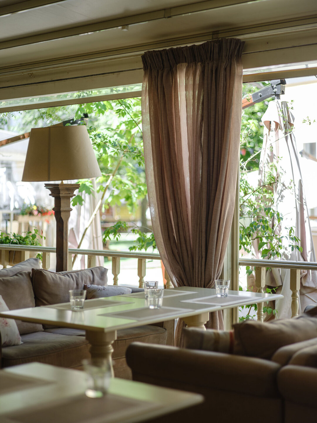 Каждое лето во дворе среди деревьев и цветов появляются две просторные веранды с мягкими диванами, креслами, торшерами, картинами и зеленью в горшках. С одной из них открывается вид на детскую площадку с качелями, горками, домиками и домашними животными: кроликами и козочкой. В меню бессмертная грузинская классика и семейные рецепты: сациви из индейки, гебжалия, пхали, хачапури, лобио, чашушули, хашлама и горячий шоти. Завтраки можно заказывать весь день, до самой полуночи.