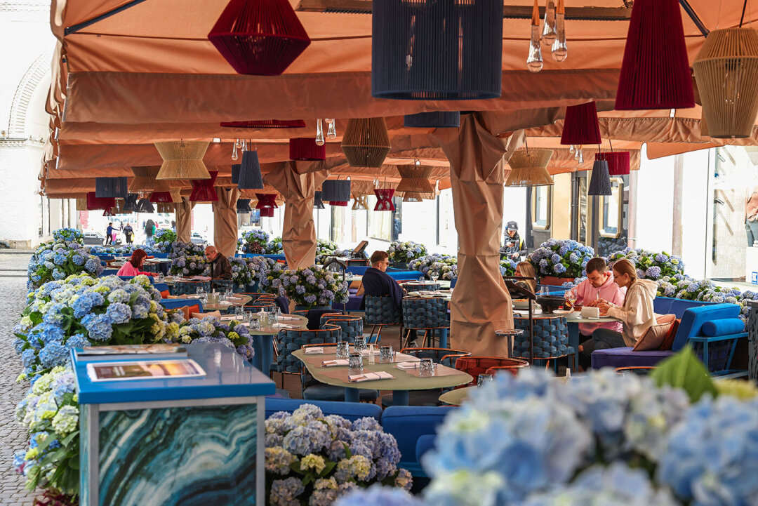 Пронзительная лазурь гортензий в тихом колодце самой короткой улицы Москвы — такой же признак лета в столице, как и безумствующие на ее улицах самокаты. Здесь особенно ощущается ритм и энергия Третьяковского проезда, известного как «пешеходная улица бутиков». Для летних обедов и ужинов рекомендуем ризотто с крабом, сыром сулугуни и спаржей и филе подкопченного палтуса с пюре из зеленого горошка, а на компанию — кассероль с тремя видами краба и морепродуктами по-средиземноморски.
