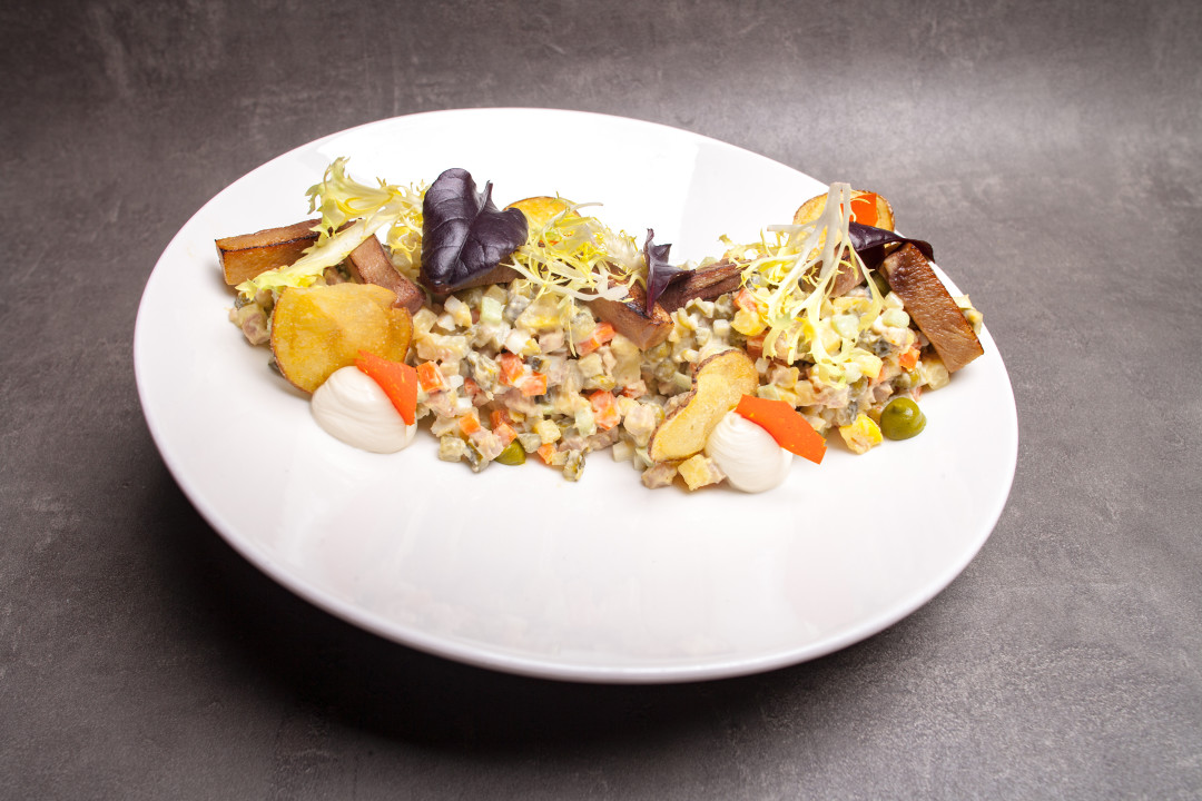 Оливье… в принципе, этим словом все сказано. Он – звезда и легенда, главный гость новогоднего стола, предмет культа традиционалистов и яростного отрицания ЗОЖников. Главный новогодний салат жил, жив и будет жить, в ресторанах Нижнего – в том числе.