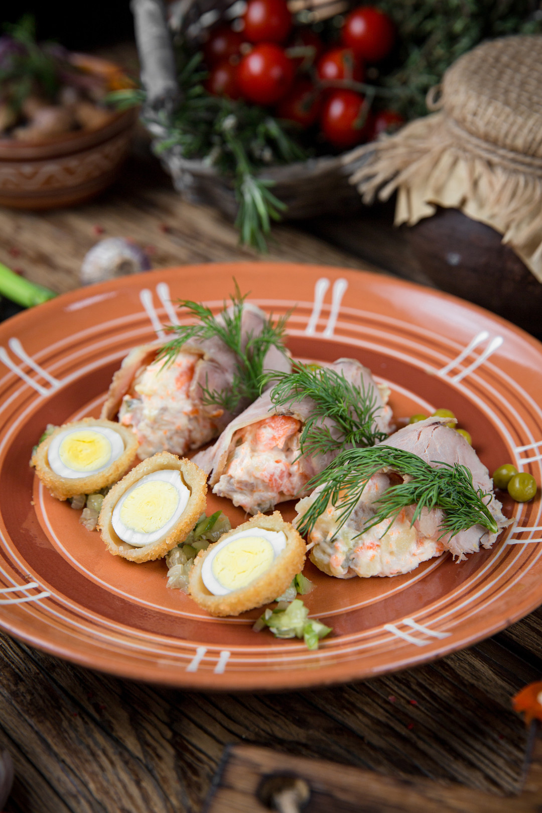 Все как дома, но все-таки лучше. Классический салат в корчме «Хуторок» укутывают от зимних морозов в тончайшие слайсы нежной буженины, рядом укладывают перепелиные яйца в хрустящей, как первая наледь, панировке. Вокруг заботливо разложены «снежки» консервированного горошка и огуречные кубики, а венчает все это столь милый русскому сердцу укроп. Словом, в здешнем «Оливье» есть все, чего вы от него ожидаете, и такая стабильность не может не радовать.