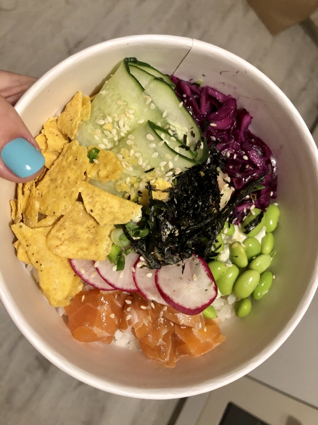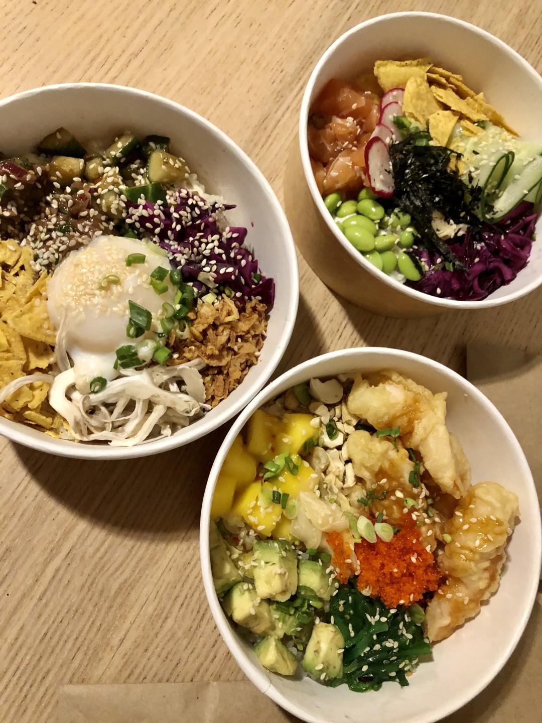 Поке – новые роллы, это гавайское блюдо теперь на каждом шагу. Представляет из себя развалы риса, киноа или чего еще с сырой рыбой, вареными креветками или мясным тартаром. Уже успело стать почти таким же популярным, как фо бо. Оно и понятно: просто, близко к желудку, сбалансировано, красиво, визуально много. И себестоимость приятная. В роллы морковь не засунешь, а здесь скрутил цветочком и всем хорошо. Такое блюдо и продавать можно дороже. Хоть отдельную статью пиши. Обычно поке водится в доставке, но вот открылось и на фуд-корте в «Небе». Цветное, яркое. Если взять целую порцию, получится как полноценные первое-второе-третье. Но из личного опыта рекомендую вам классику с лососем. Везде, и здесь тоже, потому что с местным тартаром из говядины у меня не задалось – жилистый и не дружит с белым соусом. Поке с креветкой здесь могут сделать двумя способами: отварить ее или приготовить в кляре. Зачем вам к рису ещё и тесто, берите варёную. Полная порция легко составит целый обед взрослого человека. А вместе с напитком обойдётся рублей в 600.