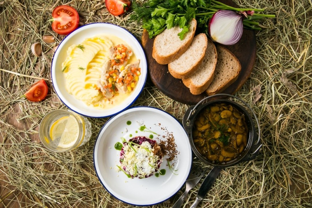 Для хитрых хозяюшек, которые не упустят возможности накормить важных гостей «домашней едой как в ресторане». Есть блюда полностью готовые, есть те, что нужно разогреть в духовке. Этот момент вообще можно запечатлеть на видео и выложить в сториз, чтобы уж никто не усомнился в том, что вы умеете готовить. Практически все ингредиенты с личной фермы ресторана в Павловском районе. Много сезонных продуктов: клюква, облепиха, морские ежи, узбекские томаты, фиолетовый картофель, топинамбур. Для заказа доступны оливье с томленой телятиной, салат с камчатским крабом, слабосоленый лосось под шубой с красной икрой, греческий салат с овечьим сыром. На горячее – фермерская утка с апельсинами и яблоками, утиная ножка конфи с печеным картофелем, маринованная свинина со специями и овощами или запеченная с травами скумбрия. Еще есть паштеты из куриной печени или кролика, томаты конфи с пряными травами, мини-брускетты со шпротами и огурцом или с красной икрой, фуа-гра с малиновым соусом и домашние бочковые соленья.