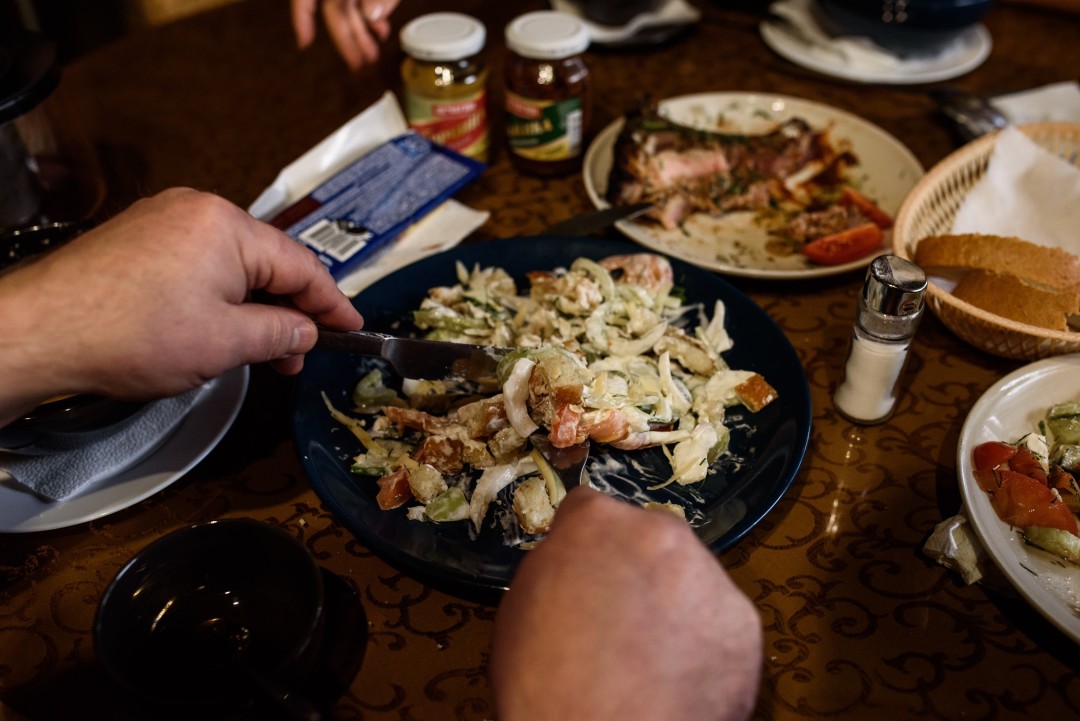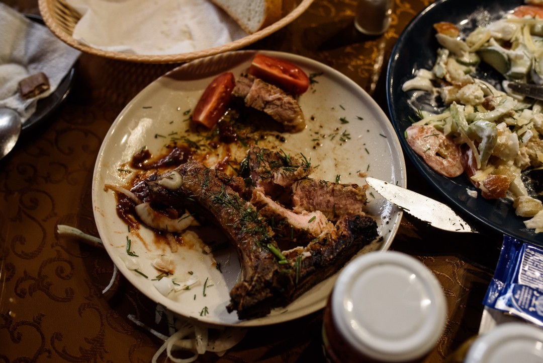 Кафе на трассе. По фасаду растяжка «Мы открылись». Но по всему видно, что висит она не первый год. На входной двери наклейка «Проверено Ревизорро». «Классная у вас наклейка», — говорим женщине за стойкой. «Не знаю. Не в мою смену было», — отзывается та. Меню как такового нет. Сегодня гороховый суп, цезарь, греческий, винегрет, плов и свинина на кости. Берем всё и чай. Получается 1460 рублей на троих. Идем к столику рядом с камином. Через 15 минут подают еду.