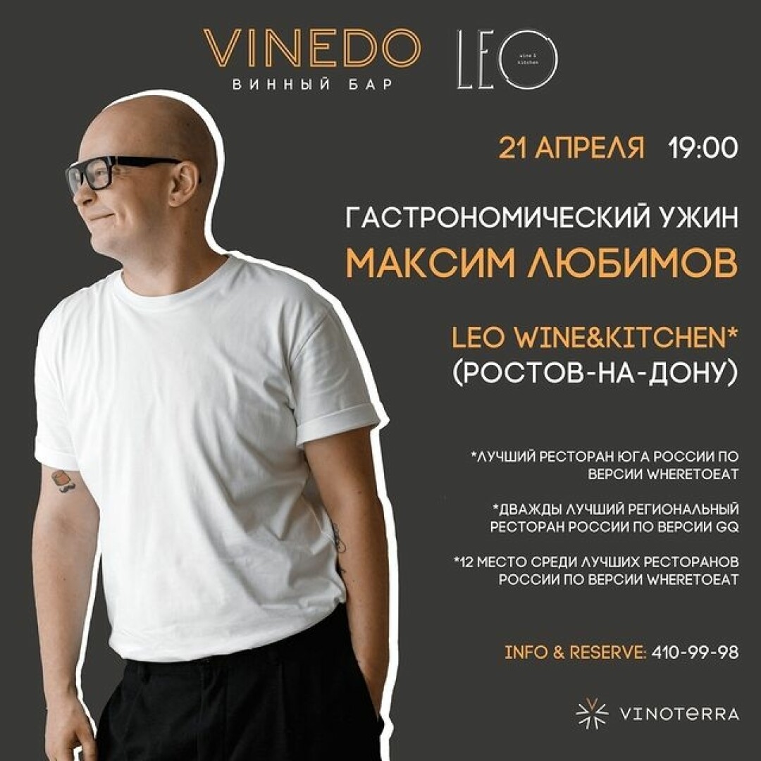 Гастрономический вечер с эно-сопровождением от шефа Максима Любимова из бара LEO Wine&Kitchen пройдет в баре Vinedo. Любимов – один из самых талантливых шеф-поваров современной России из Ростова-на-Дону. Гостей ждет девять авторских блюд и эно-сопровождение к каждой подаче.