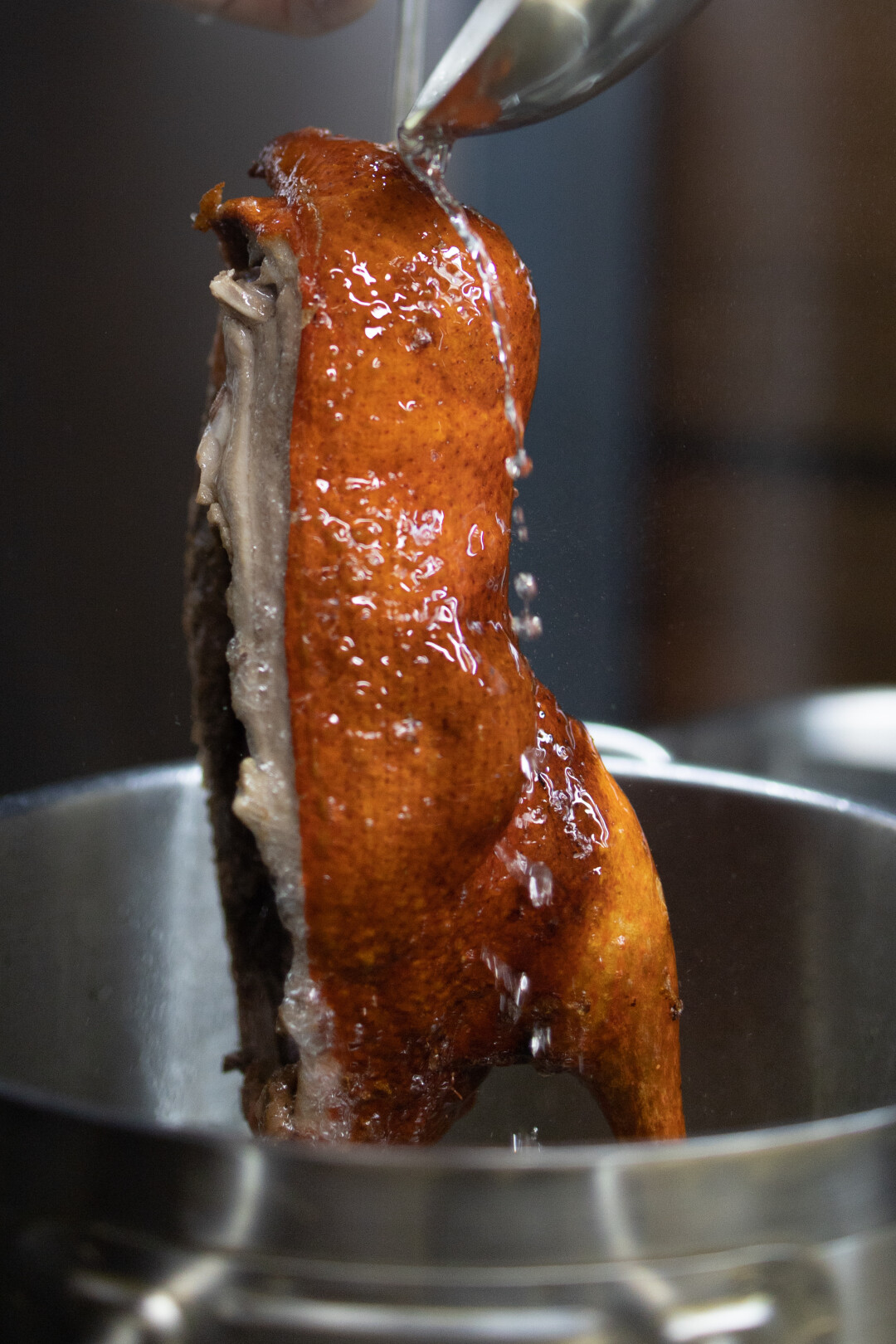 В первую очередь это должна быть птица от проверенного производителя, которому ты полностью доверяешь. В нашем случае речь идет о птице, выращенной специально для нас на экоферме «Павлово», находящейся в Павловском районе Нижегородской области. В Китае есть целые хозяйства, которые выращивают утку специально для этого блюда, но основные требования касаются количества жира, правильного корма, гладкости кожи. В этом отношении птица, которую выращивают для нас в Нижегородской области, полностью подходит. По сути, все в нашей пекинской утке, за исключением специй и соусов, локальное.