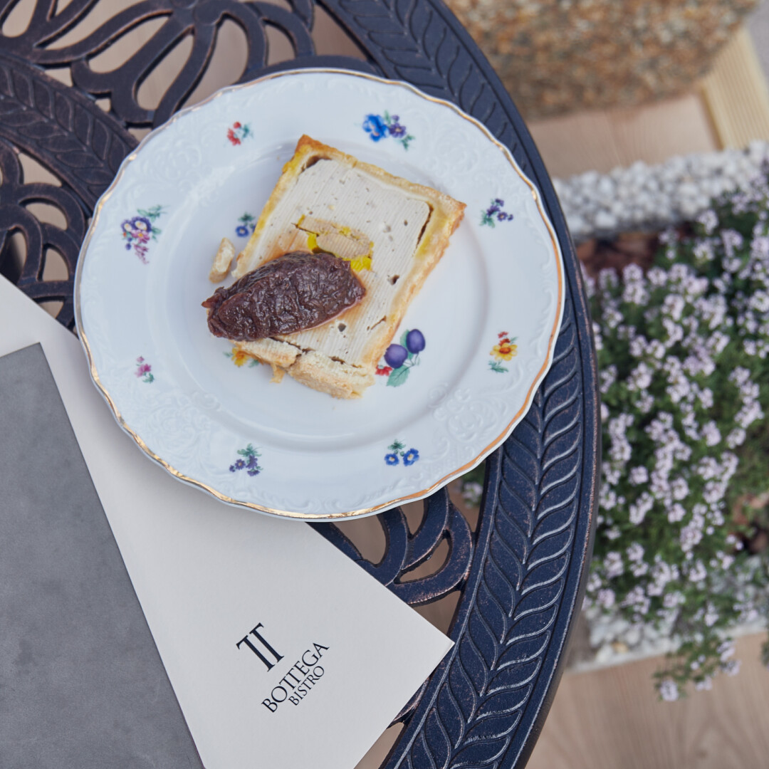 - Пате из лесных грибов, копченное на можжевельнике с бородинским хлебом, и грибным взваром.