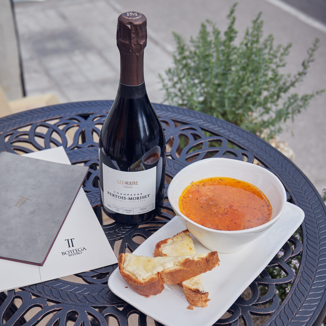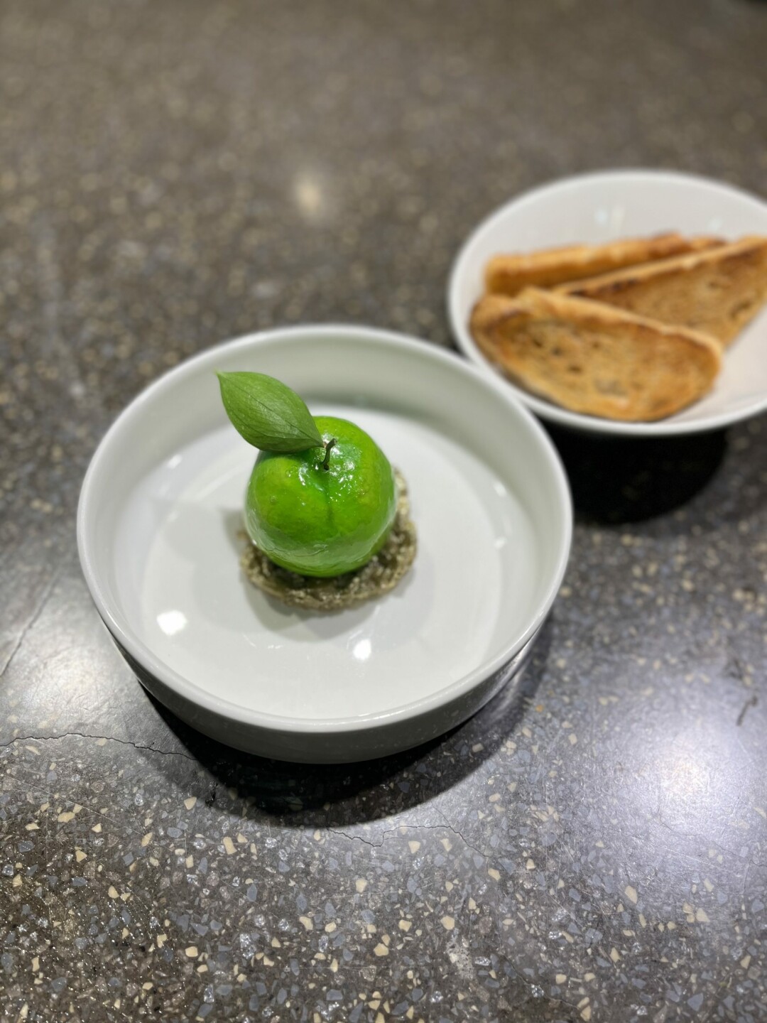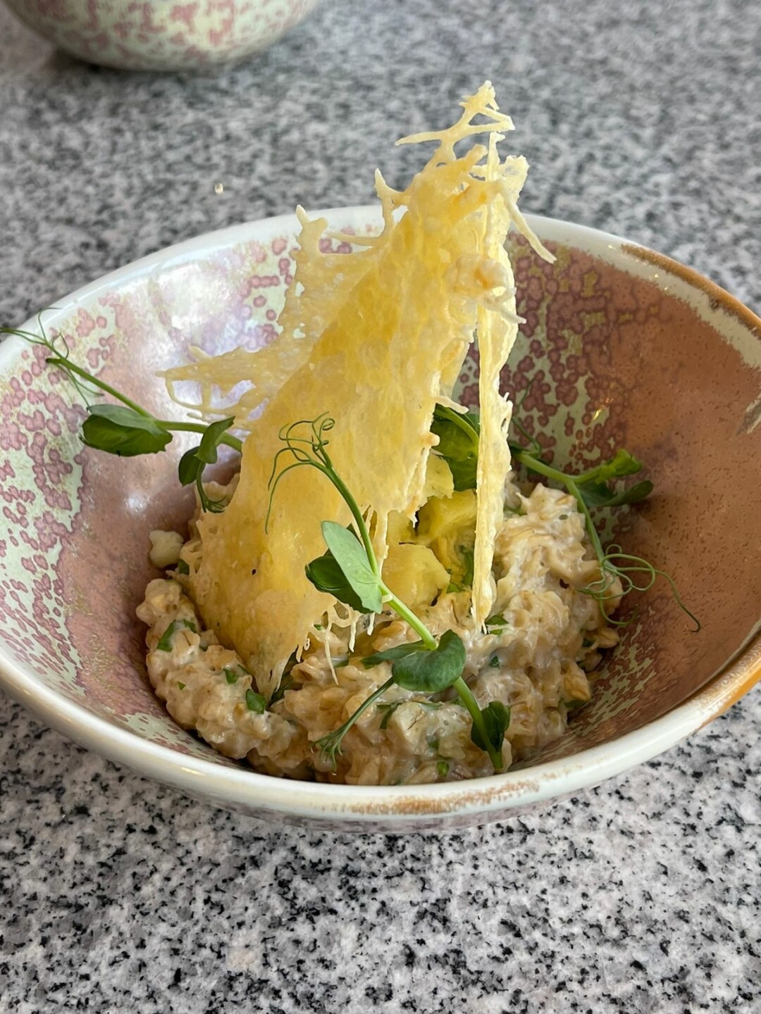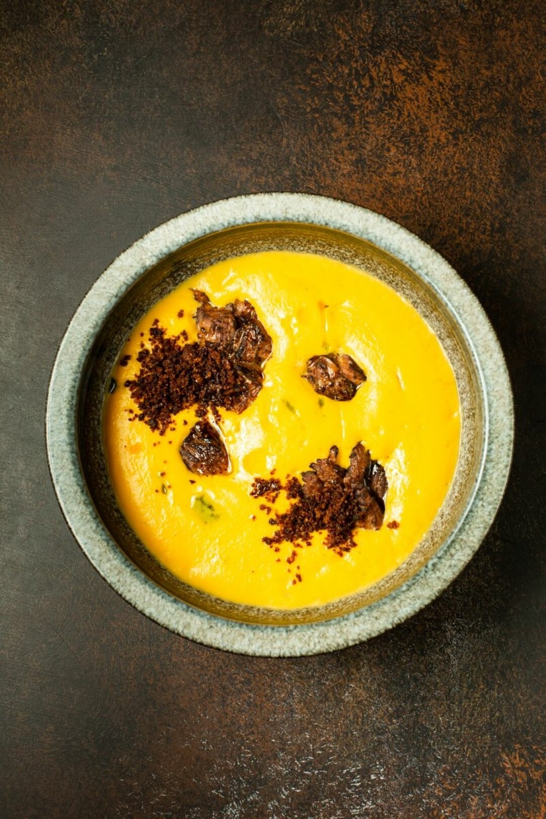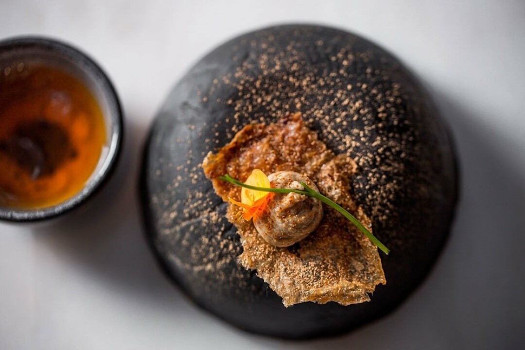 - Эспума-суп из репы с жженым бычком и деревенским хлебом.