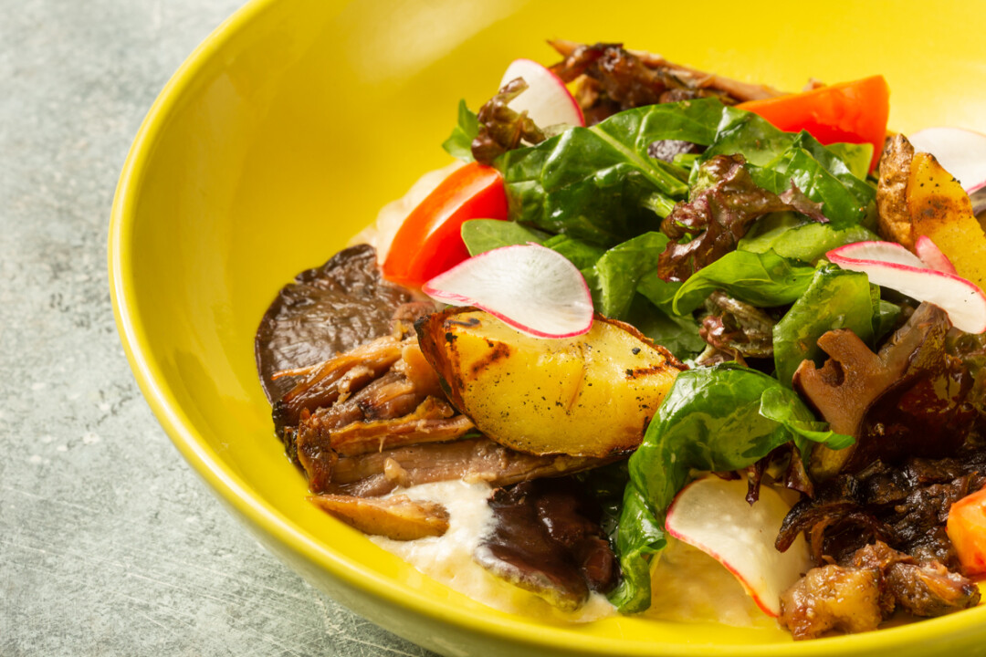 - Судак с карамелизированными корнеплодами и грибным demi-glace.