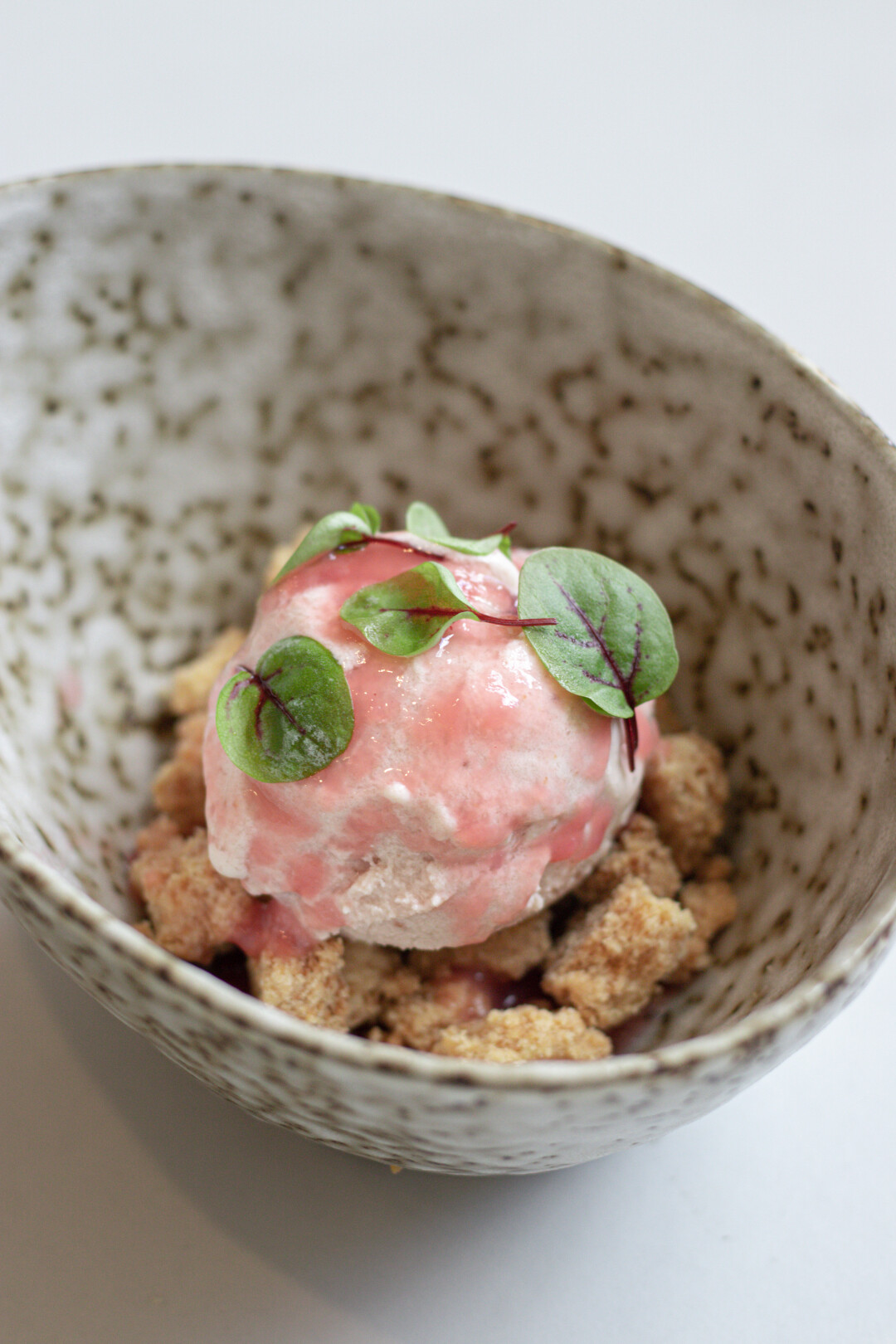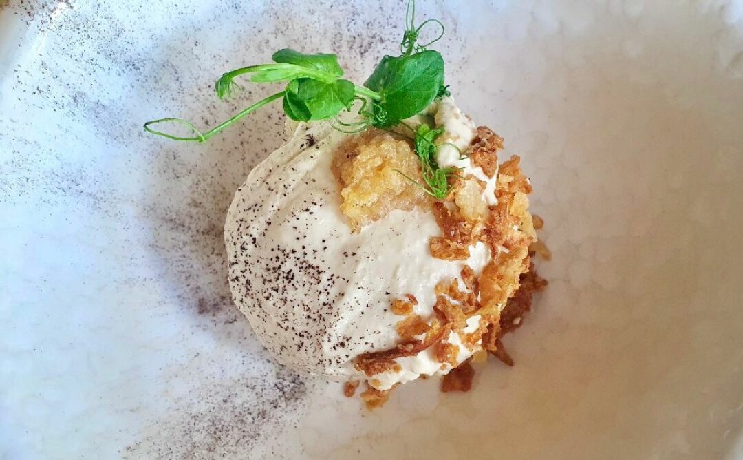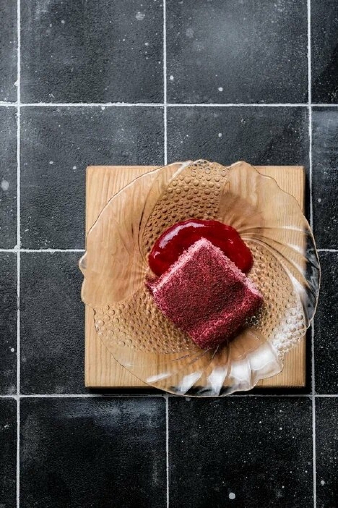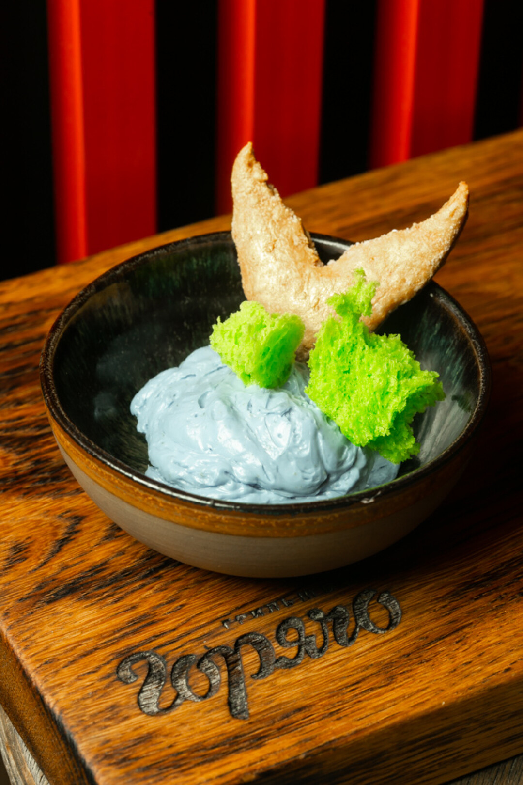 - Мусс из айрана и козьего сыра с шоколадной землей, свекольным мороженым, белым грибом и хрустком со льном.