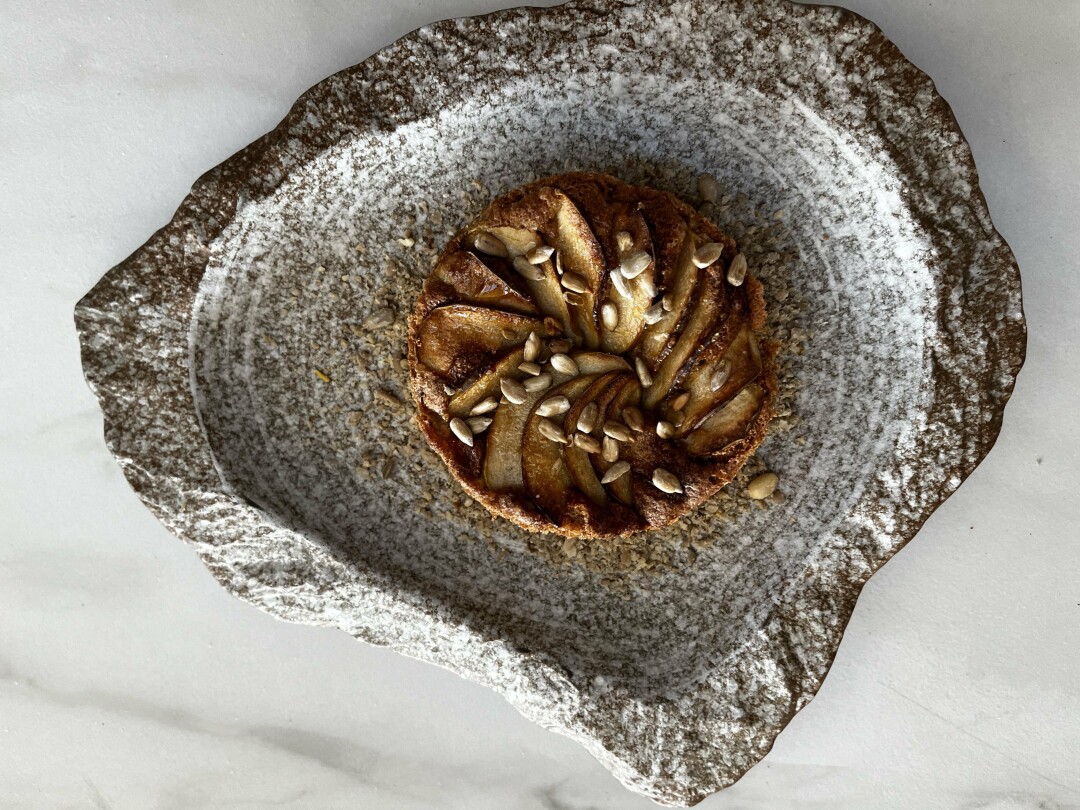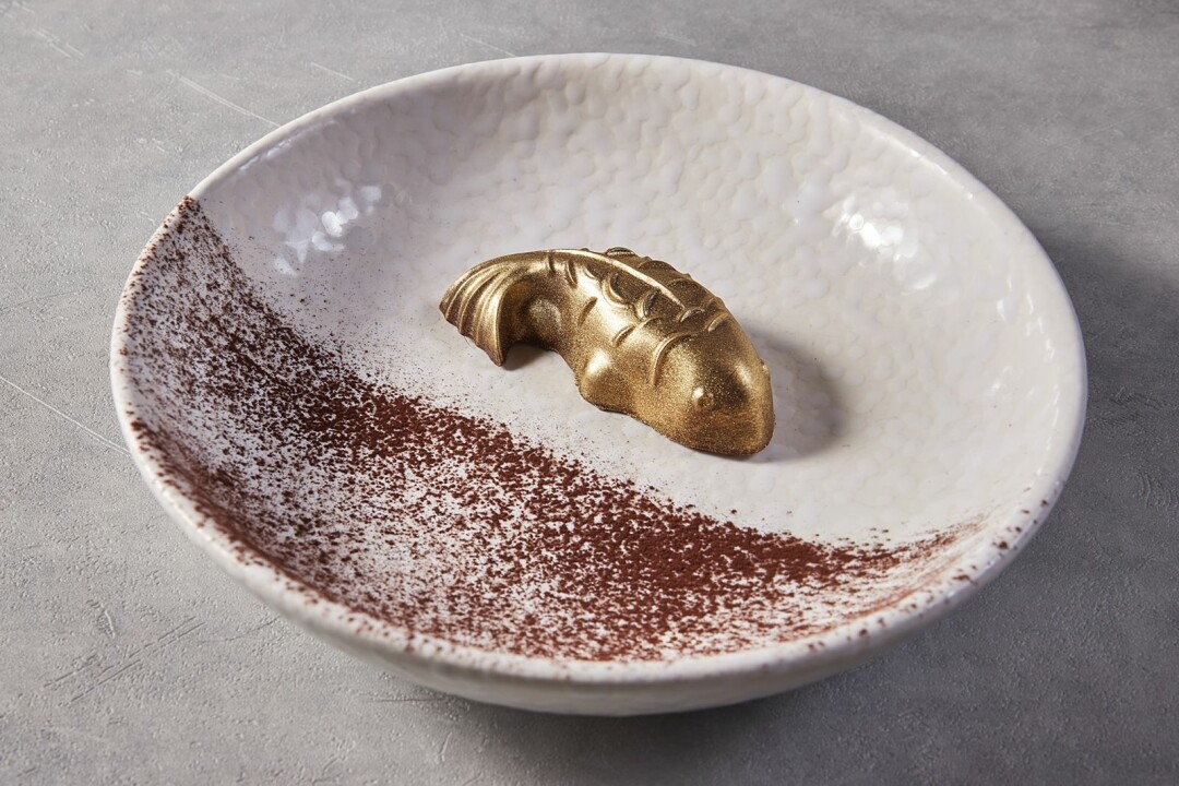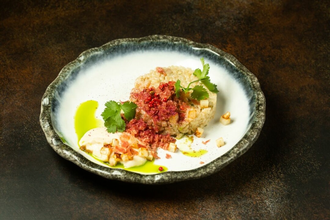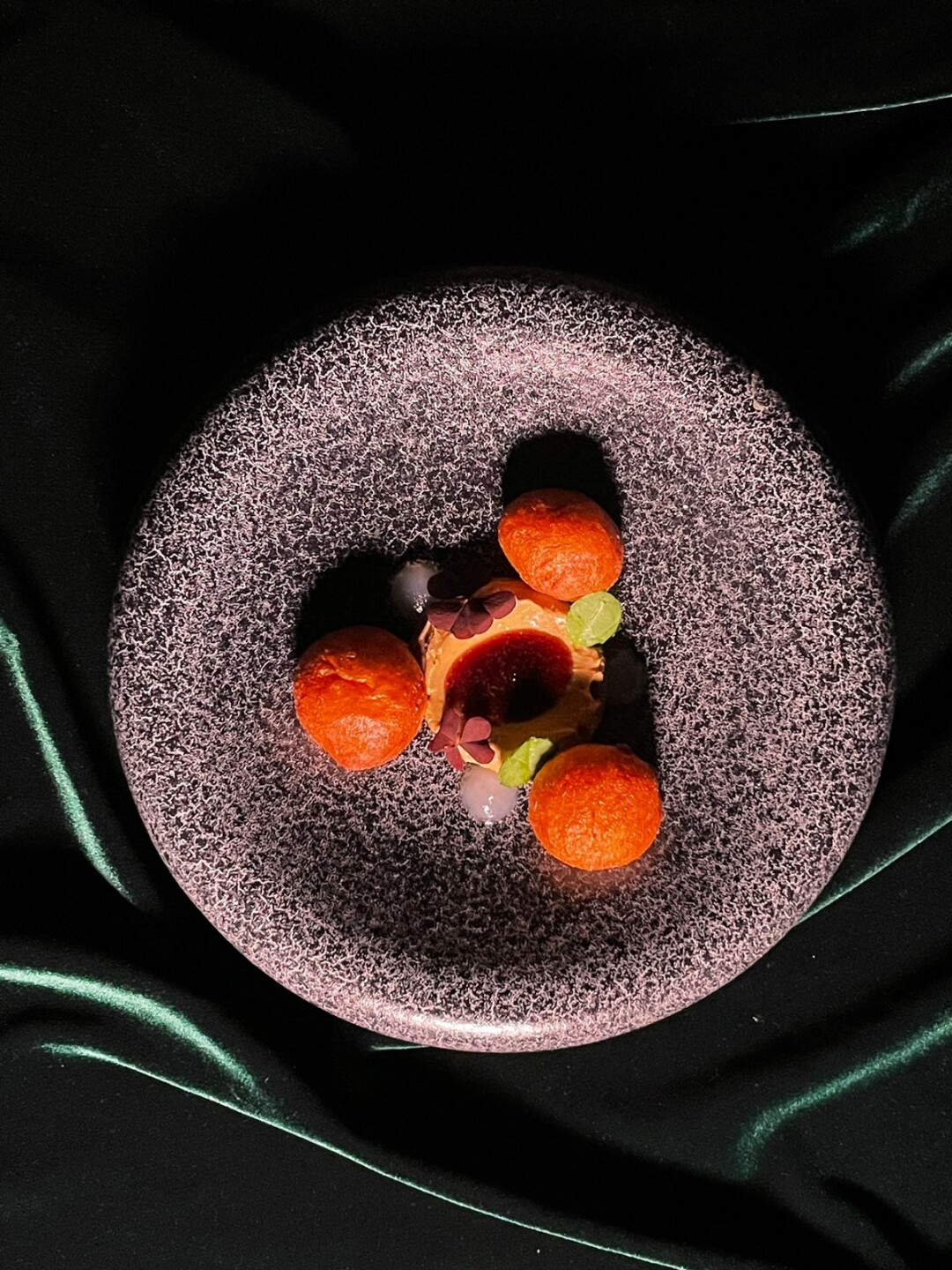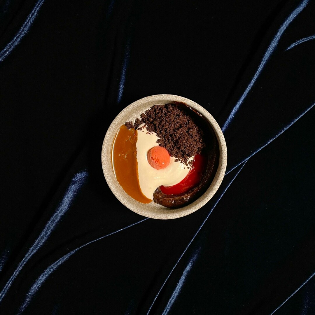 - Мусс из айрана и козьего сыра с шоколадной землей, свекольным мороженым, белым грибом и хрустком со льном.