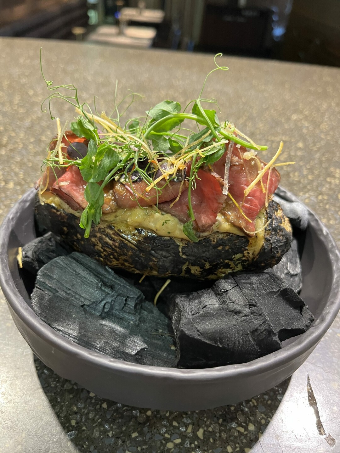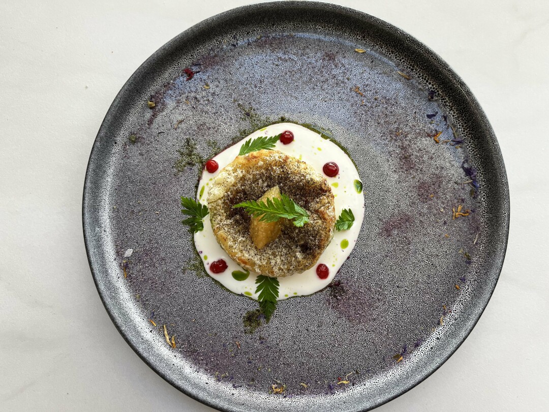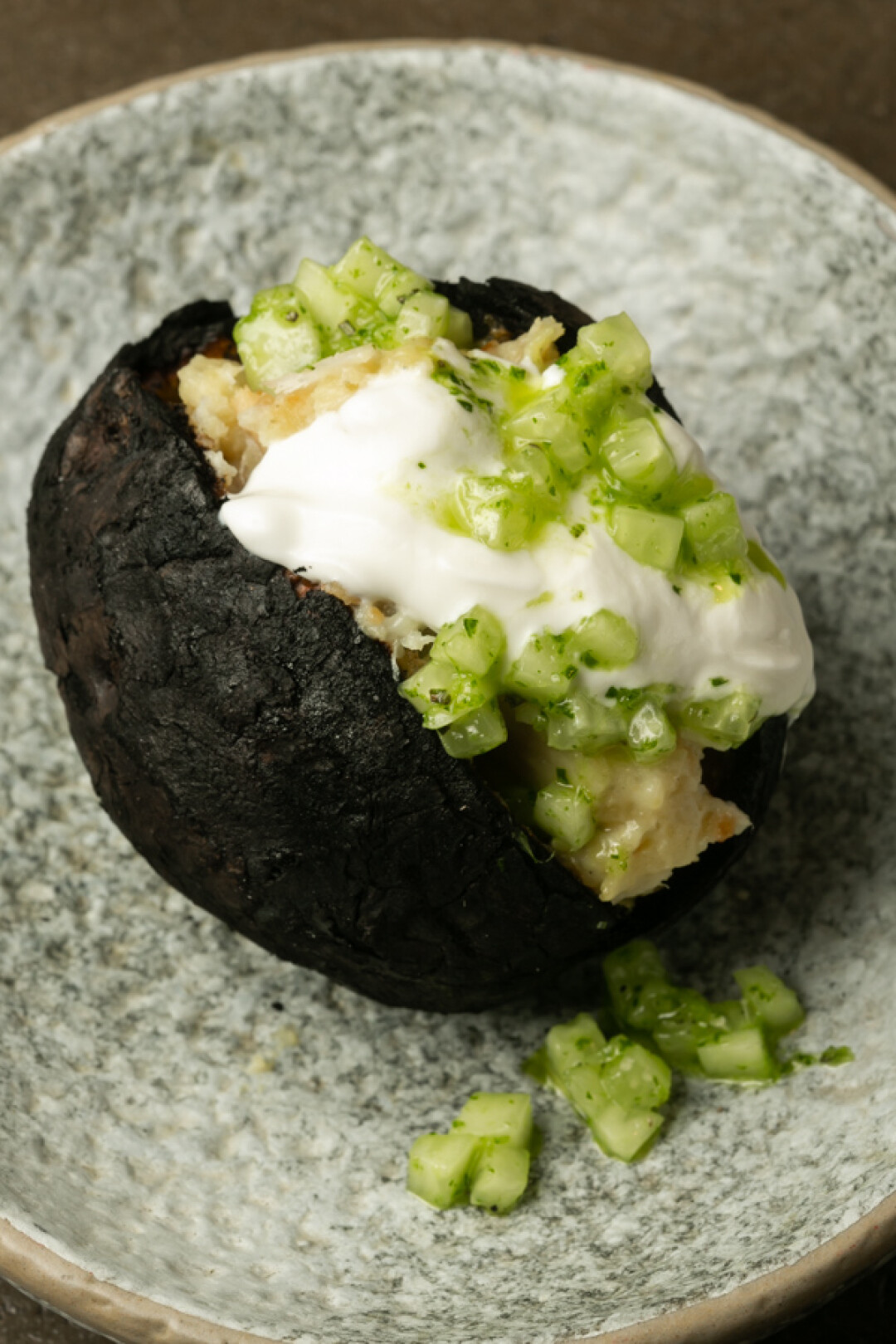 - Драник из печенного в золе картофеля с копченой сметаной и щучьей икрой.