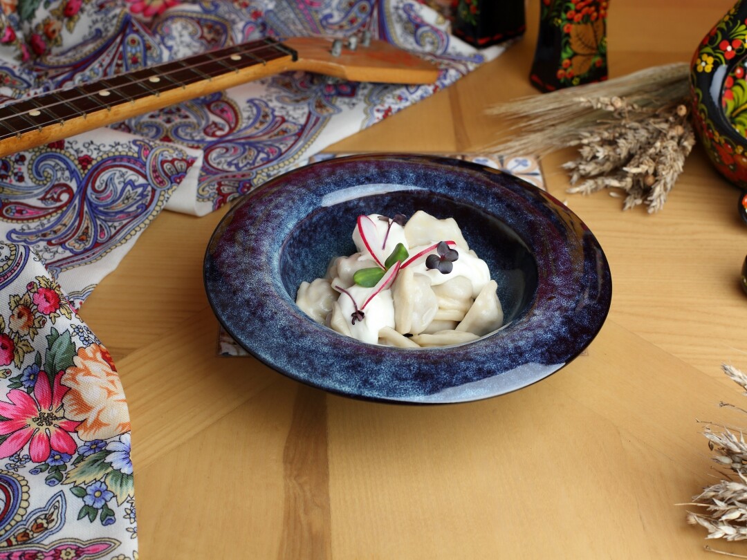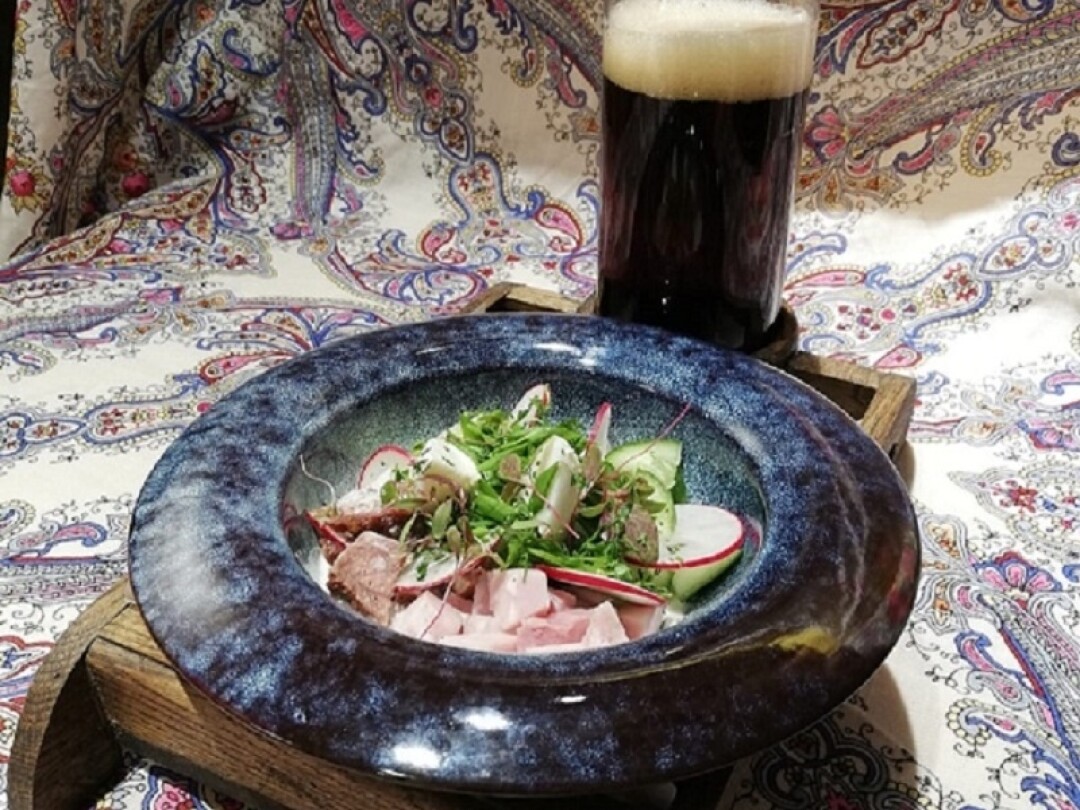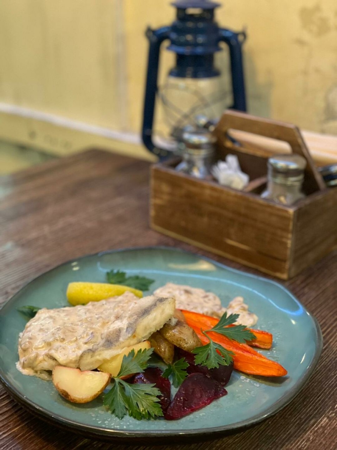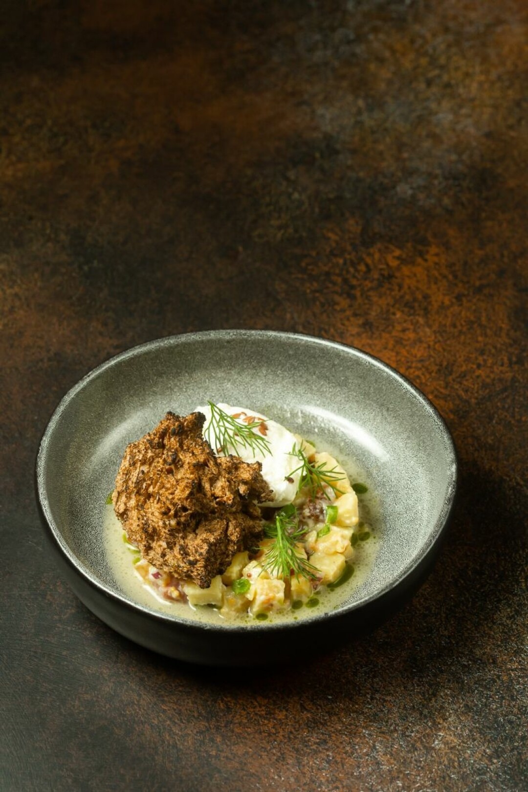 - Деревенское крошево из печеной картошки с копченым сомом и соусом из карасей.