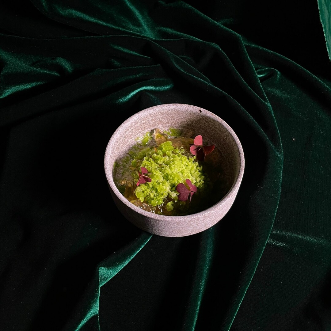 - Заливное из перепелки с лесными травами в грибном взваре.